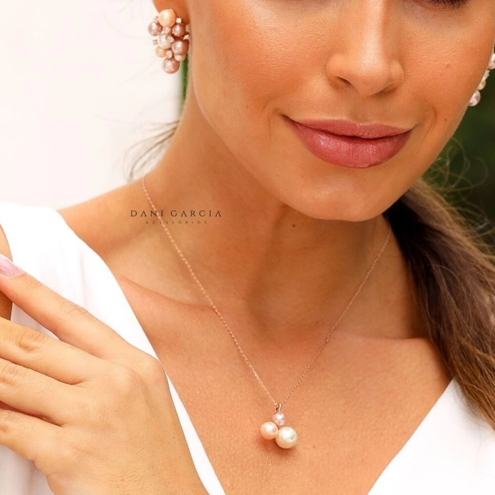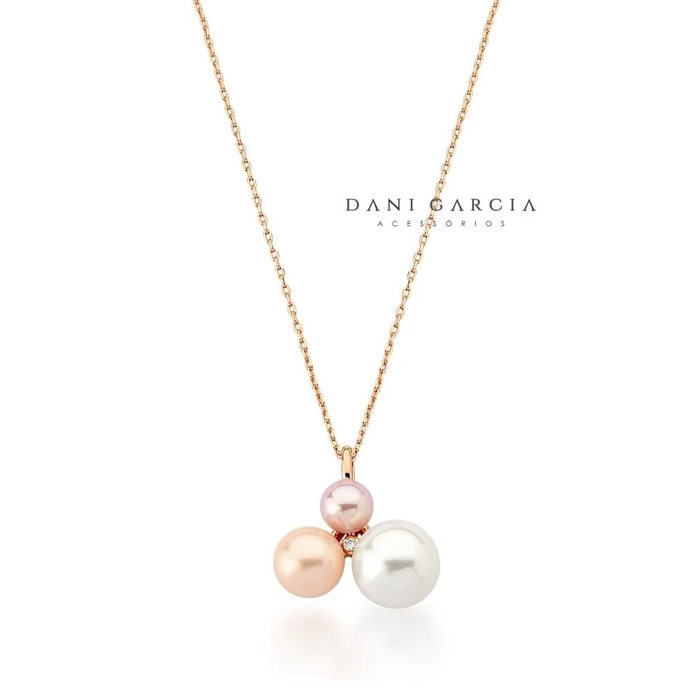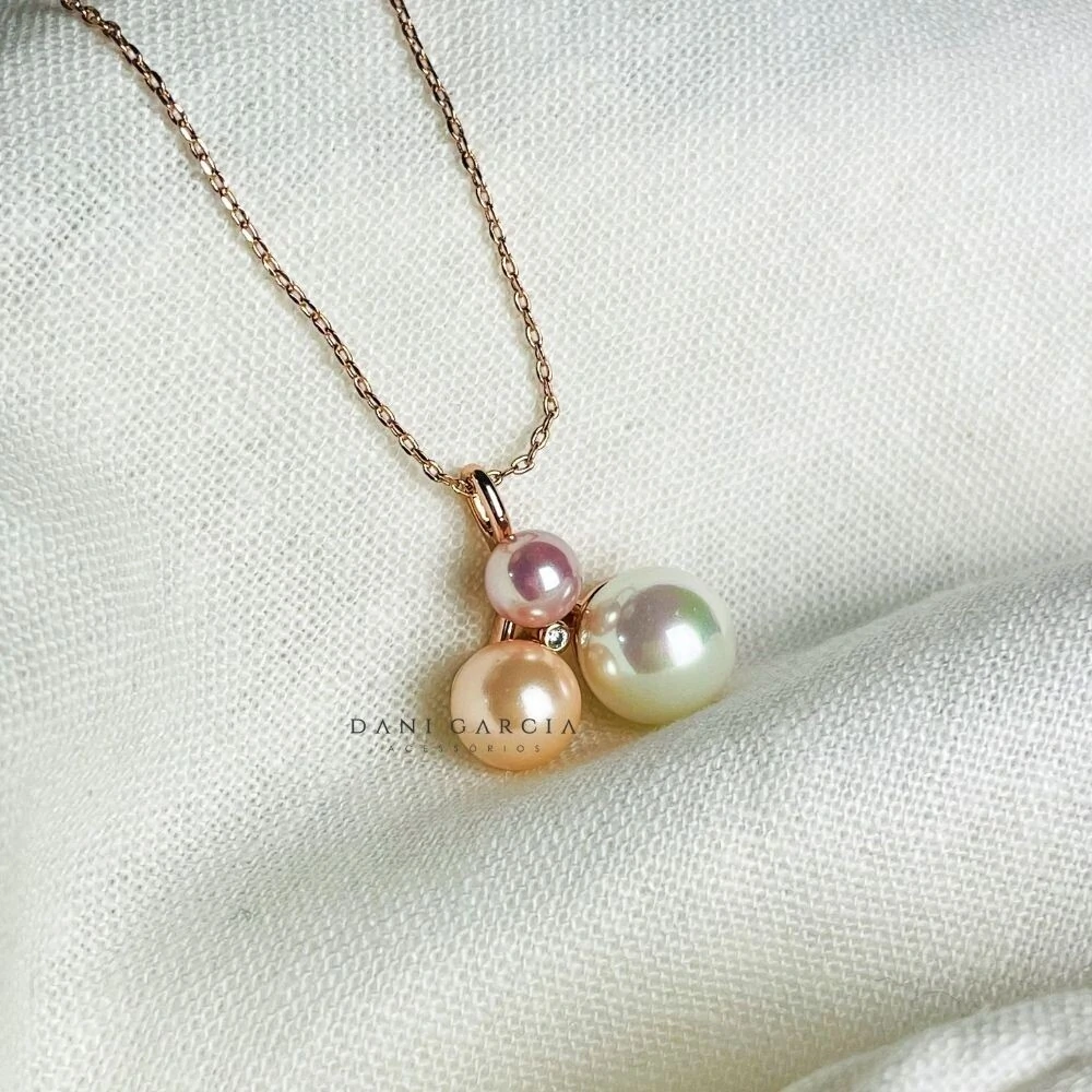 O pingente traz três pérolas shell em tons suaves — branca, pêssego e rosa — criando um visual feminino, moderno e cheio de personalidade.