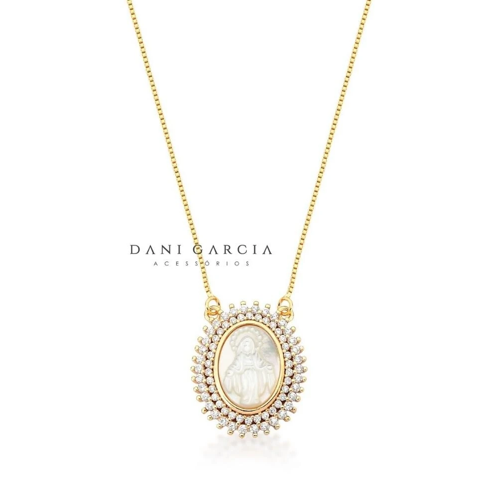 O pingente oval traz a imagem de Nossa Senhora esculpida em madrepérola, rodeada por um contorno de zircônias que criam um brilho sutil e elegante, no estilo princesa.