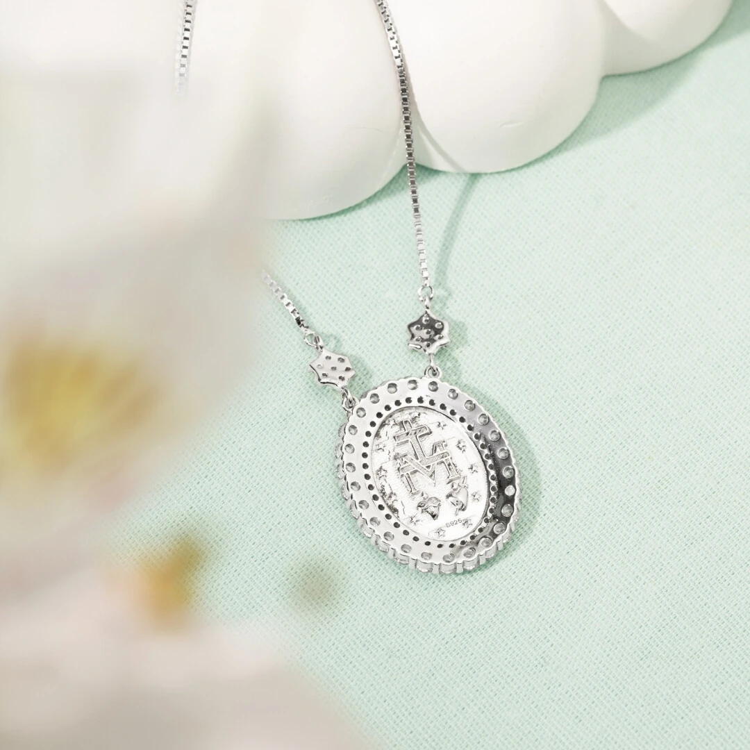 Confeccionado em prata 925, esse colar de Nossa Senhora das Graças possui um brilho encantador e uma elegância atemporal. Seu design meticuloso ressalta os traços da santa, transmitindo uma aura de serenidade e proteção.