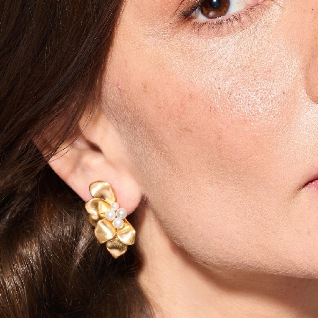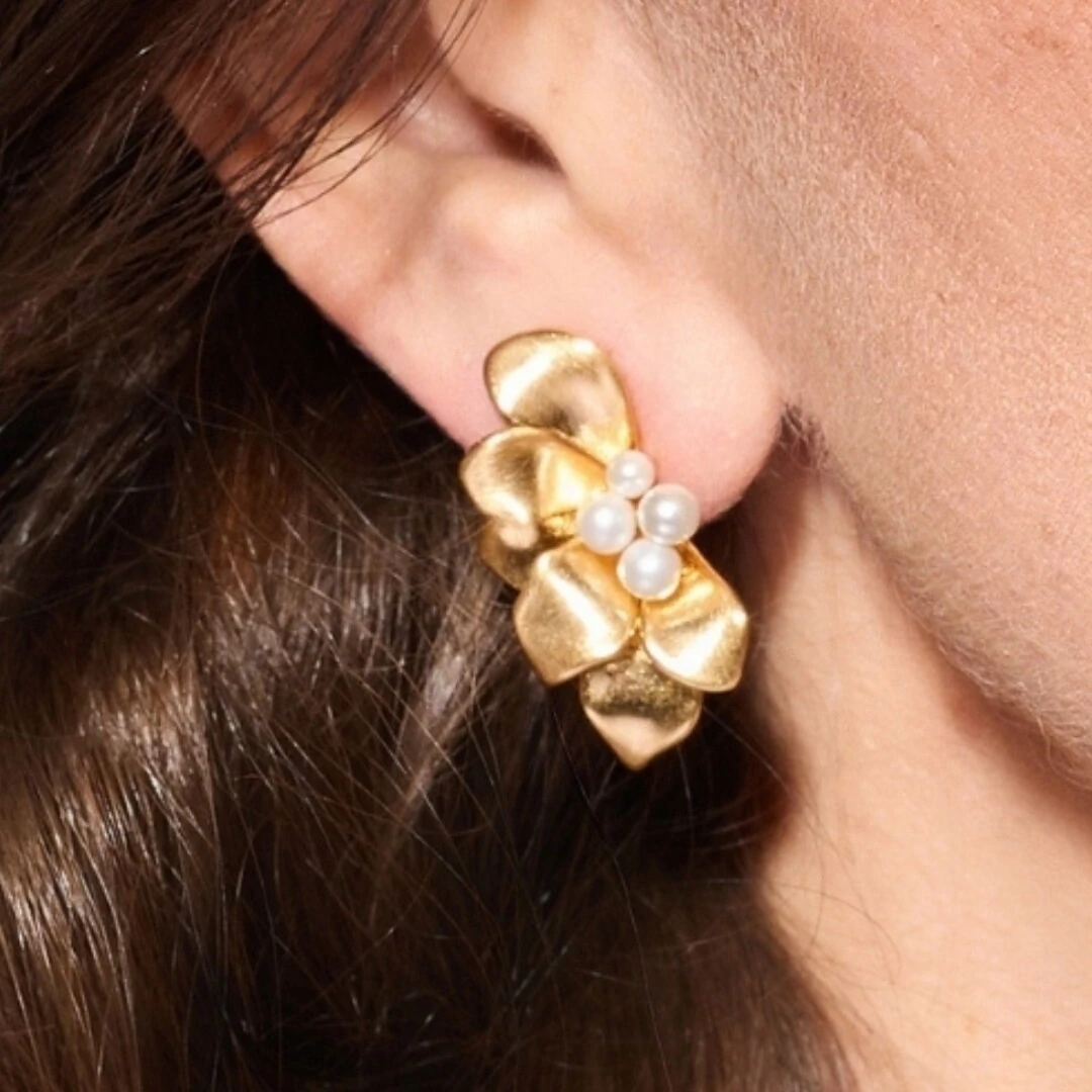 Brinco Flor Pérola Acetinado Banho de Ouro 18 K