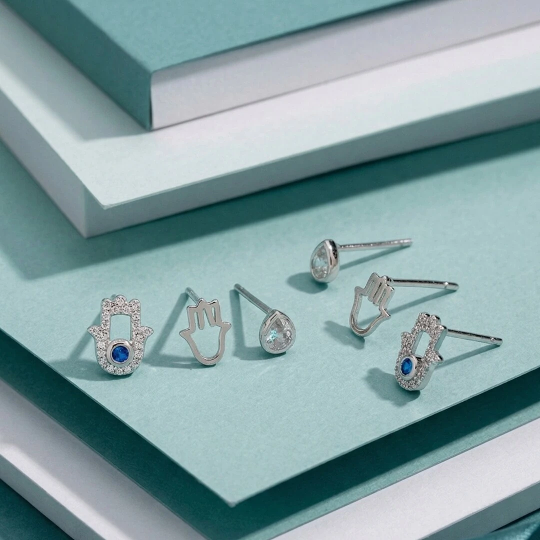 Descubra a proteção e o estilo em cada detalhe com o nosso Trio de Brincos Mão Hamsa em Prata 925.