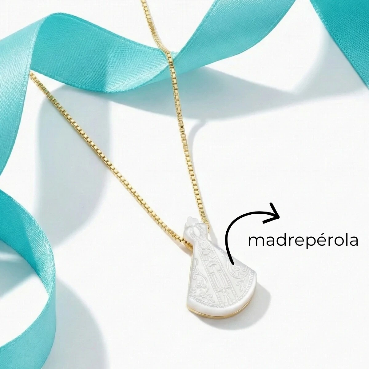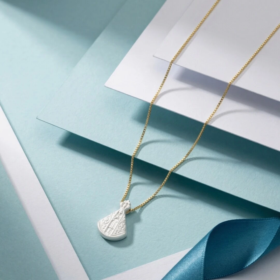 O Colar Nossa Senhora Aparecida em Madrepérola Banho de Ouro 18K é uma joia delicada que une sofisticação e espiritualidade.