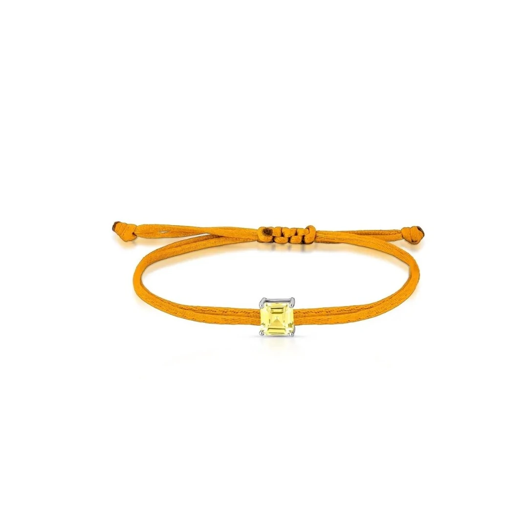 O fio encerado em tom laranja intenso ilumina o pulso, enquanto a pedra citrino em lapidação quadrada traz o toque de sofisticação da Prata 925 com banho de ródio.