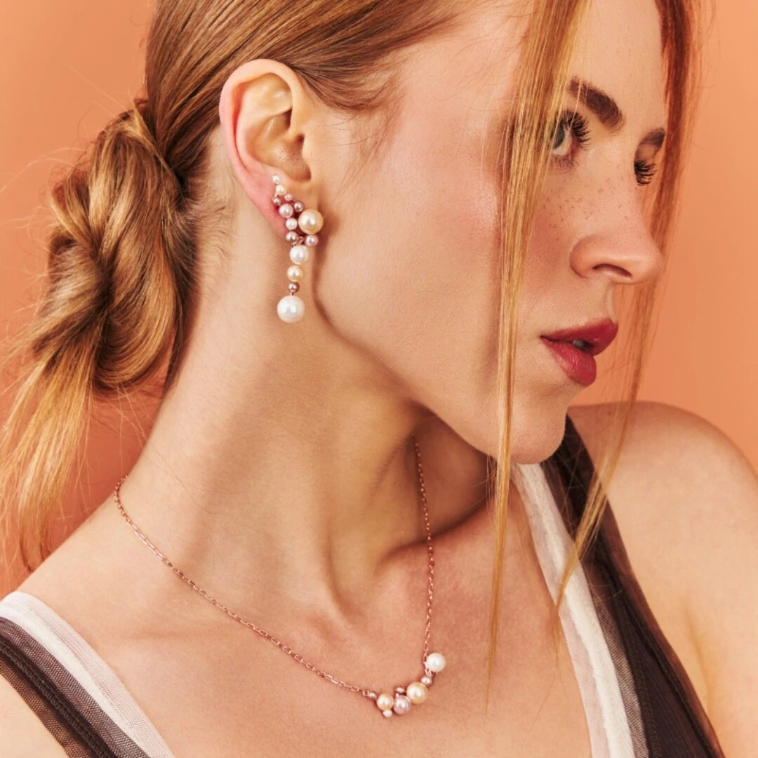 As pérolas shell em tons suaves de branco, pêssego, rosa e cinza são intercaladas de forma orgânica, criando um efeito curvo leve e sofisticado.
