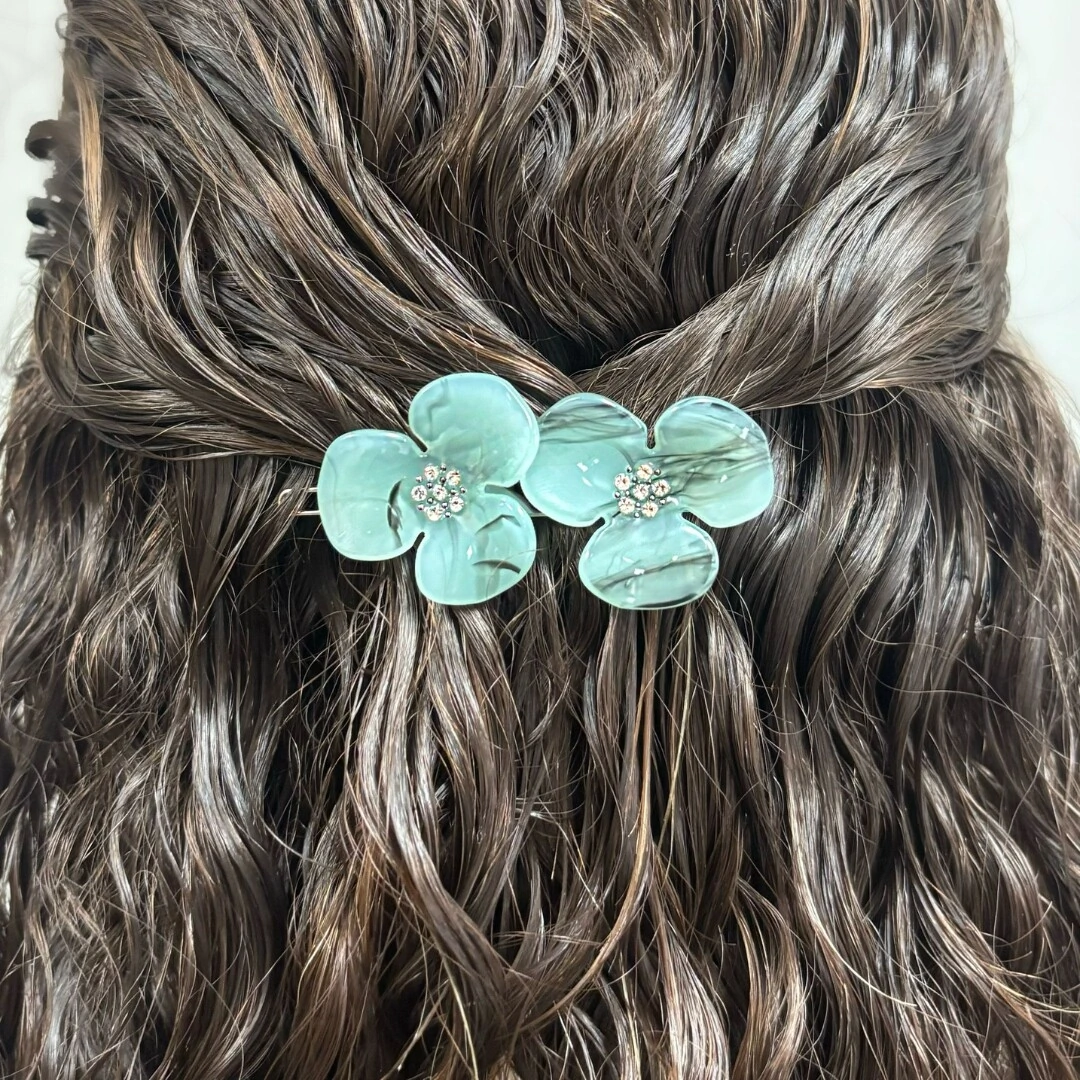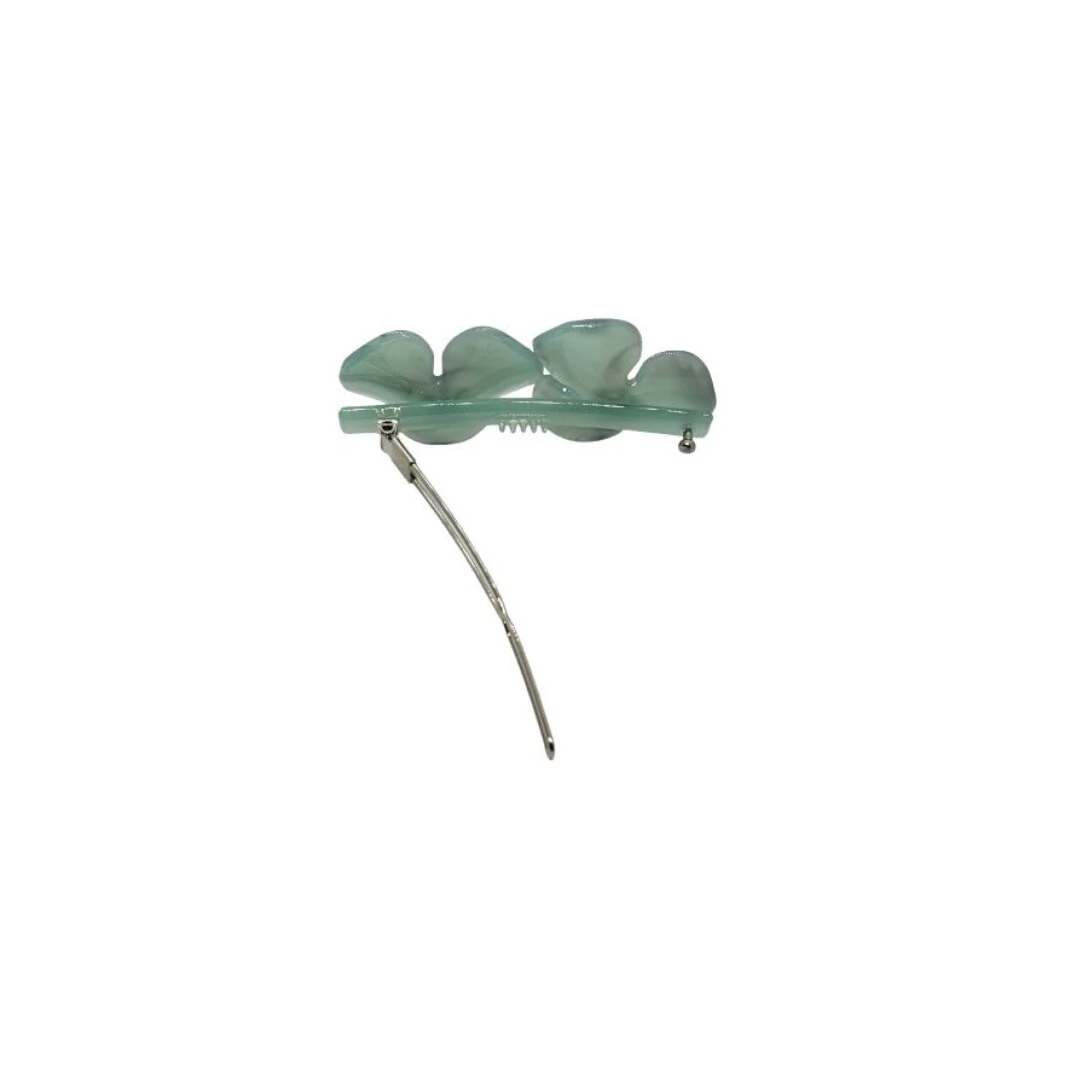 O Clipe Trevo Duplo Acetato Turquesa combina o frescor do mar com o brilho delicado dos cristais. 🌊✨