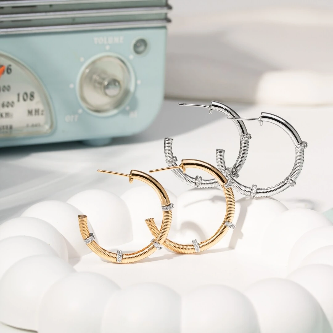 A Argola Retrô G Textura Ródio Branco é a versão iluminada da peça que conquistou corações. O banho de ródio branco dá aquele toque de elegância fria e sofisticada, enquanto a textura retrô com detalhes cravejados garante o brilho na medida certa.