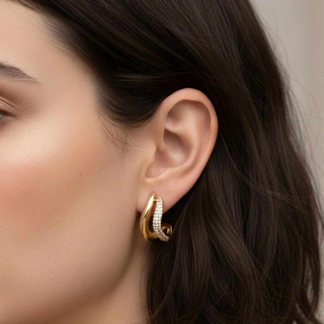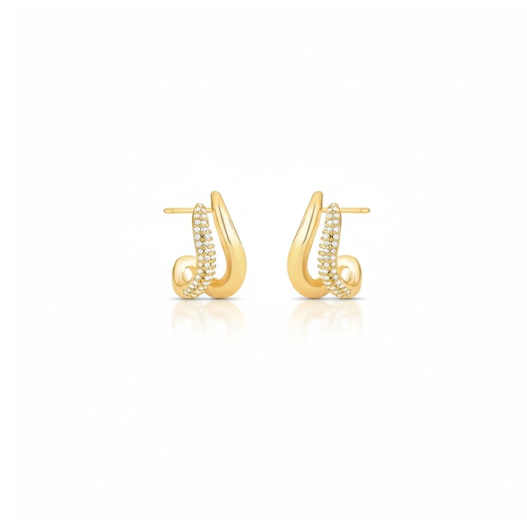 O Brinco Curvo Zircônias e Liso Banho de Ouro 18K é a união perfeita entre design moderno e elegância atemporal.