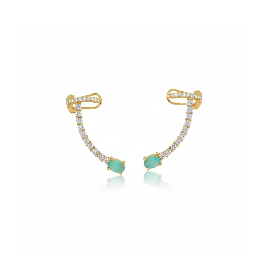 Com design curvado e cravação de zircônias que sobem pela orelha, ele traz duas pedras em turmalina fusion na ponta, conferindo sofisticação e frescor na medida certa.
