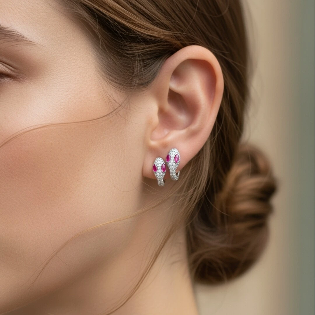 Seu design inspirado em uma serpente é totalmente cravejado de zircônias brancas, com olhos em cristal rubi, que dão um contraste vibrante e sofisticado.