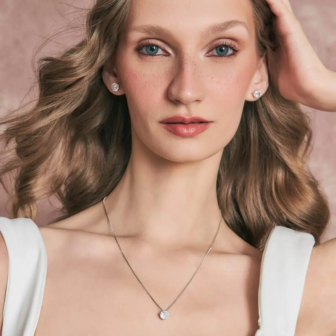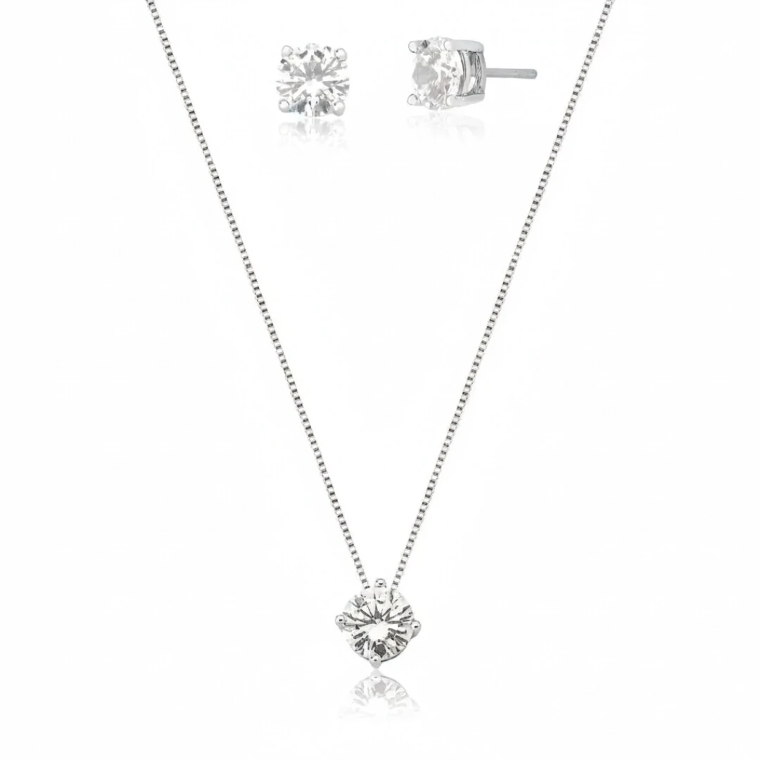 Com design atemporal, o colar em malha veneziana e os brincos solitários com zircônias lapidadas de 8 mm refletem brilho intenso e pureza em cada detalhe.