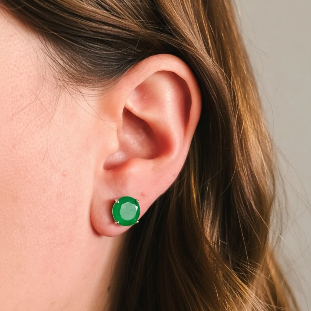 A zircônia em tom esmeralda fusion, com 10 mm, destaca o rosto com luminosidade intensa e um verde profundo que remete à elegância da esmeralda natural.