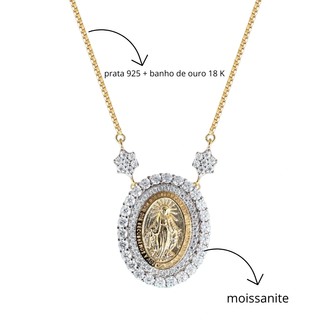 O Colar Nossa Senhora das Graças M em Moissanite Prata com Banho de Ouro 18 K é uma joia sofisticada, luminosa e profundamente simbólica.