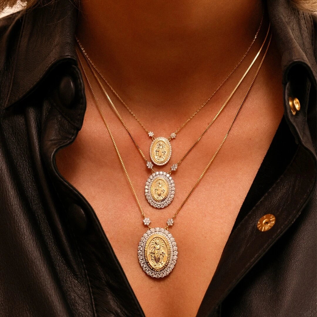 O Colar Nossa Senhora das Graças P em Moissanite Prata com Banho de Ouro 18 K é uma joia delicada e sofisticada que une fé, brilho e elegância em uma peça única.