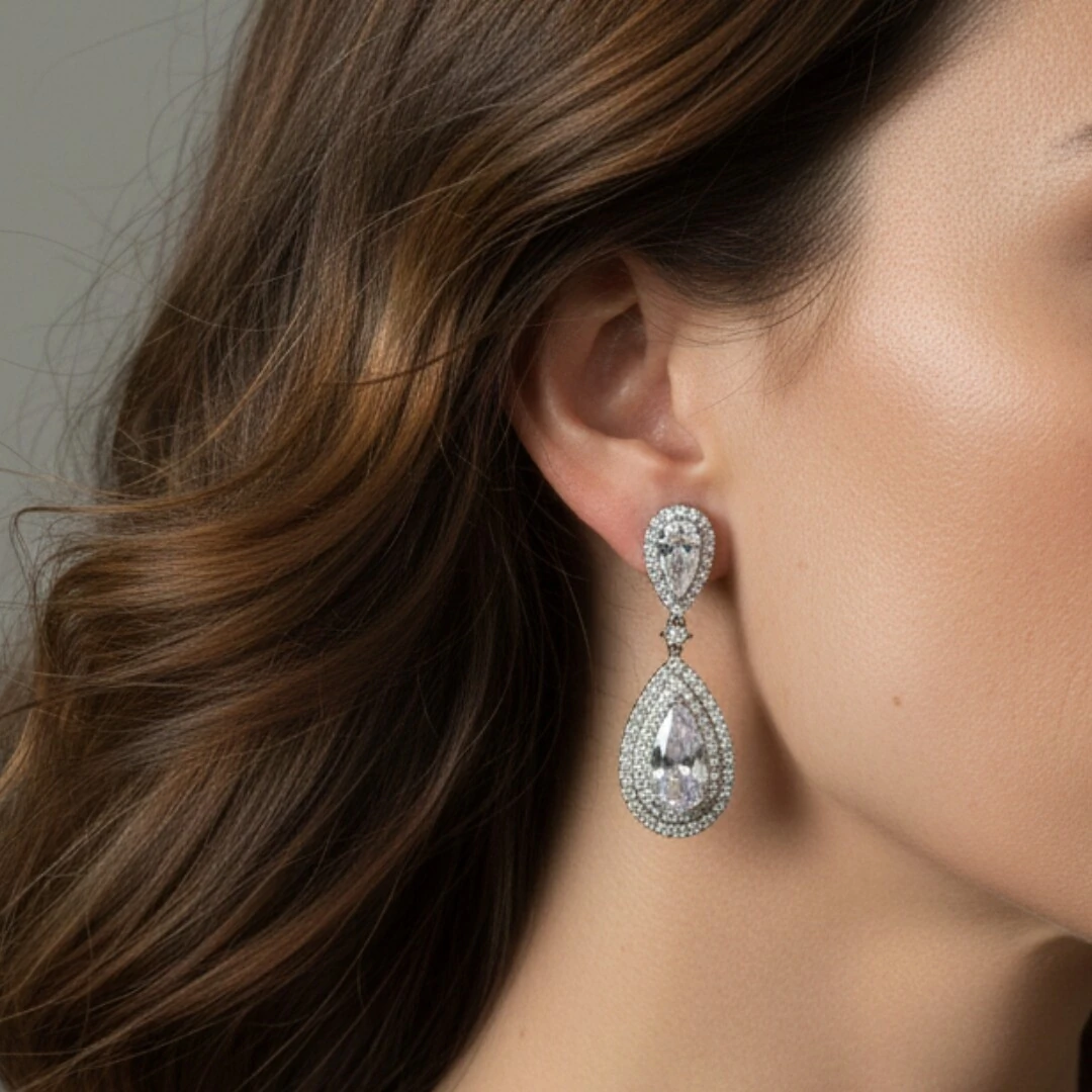Com design composto por duas gotas cravejadas — uma menor na parte superior e uma gota maior em destaque — a peça entrega brilho extremo e um visual luxuoso.
