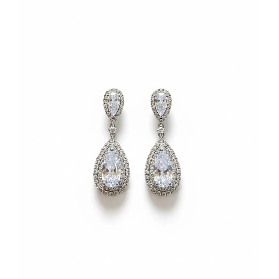As pedras em lapidação gota realçam o brilho e a profundidade das zircônias, enquanto o banho de ródio branco garante acabamento espelhado, durabilidade e elegância atemporal.
