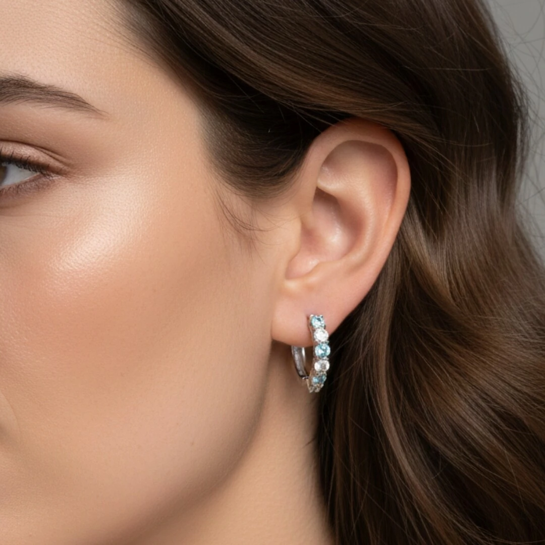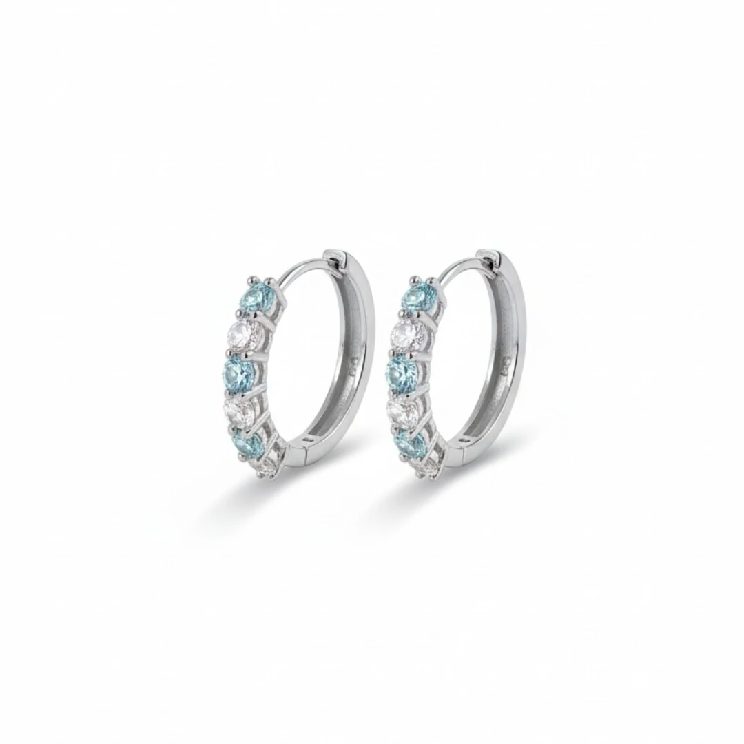 A Argola Zircônias Intercaladas Água Marinha em Ródio Branco é delicada, sofisticada e cheia de frescor.
