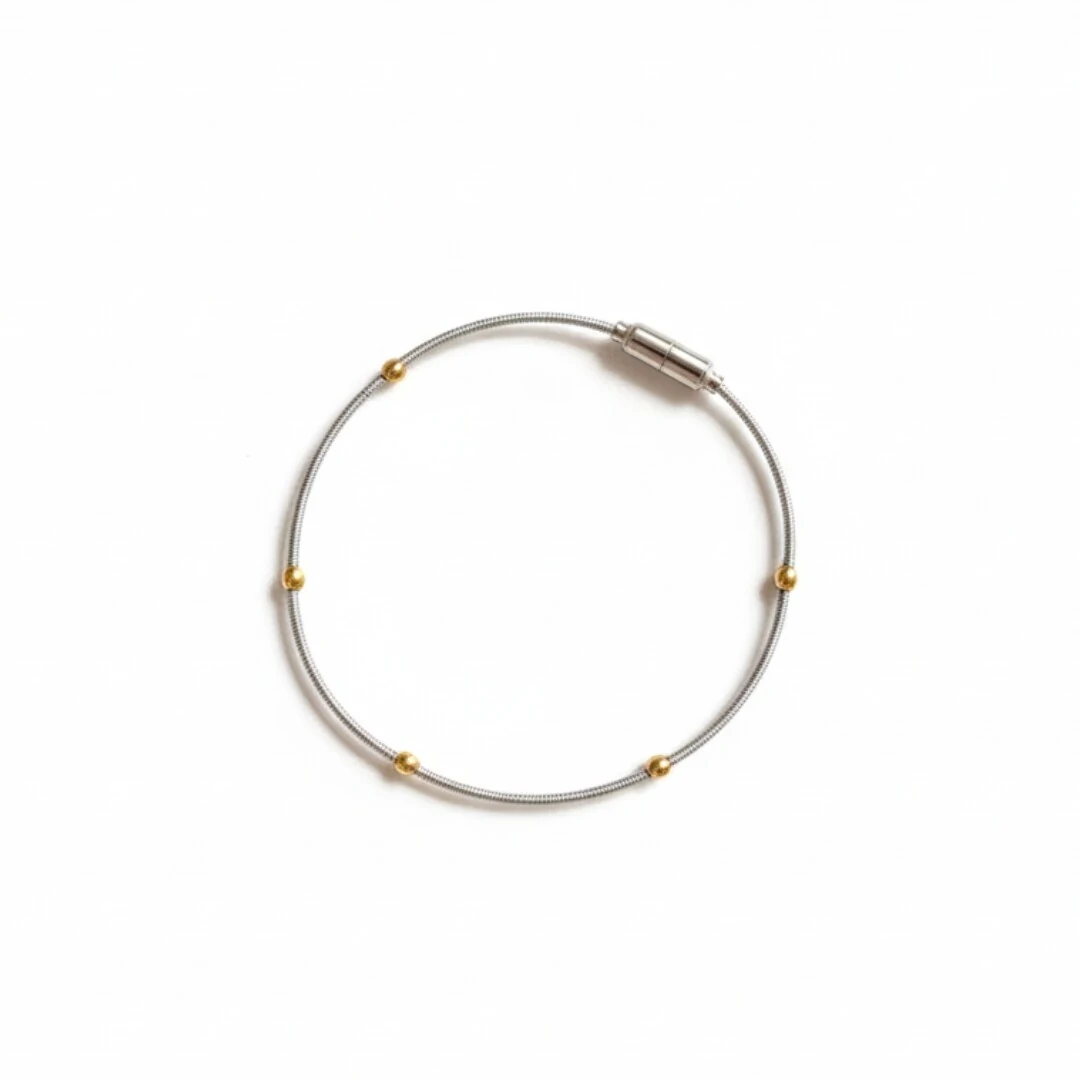 A Pulseira Corda de Violão Solitária com Bolinhas Invertidas em Ródio Branco é aquele acessório que une modernidade, estilo e praticidade em uma única peça. Seu design minimalista, inspirado nas cordas de violão, ganha charme extra com as bolinhas douradas posicionadas de forma invertida, criando um visual leve e sofisticado.