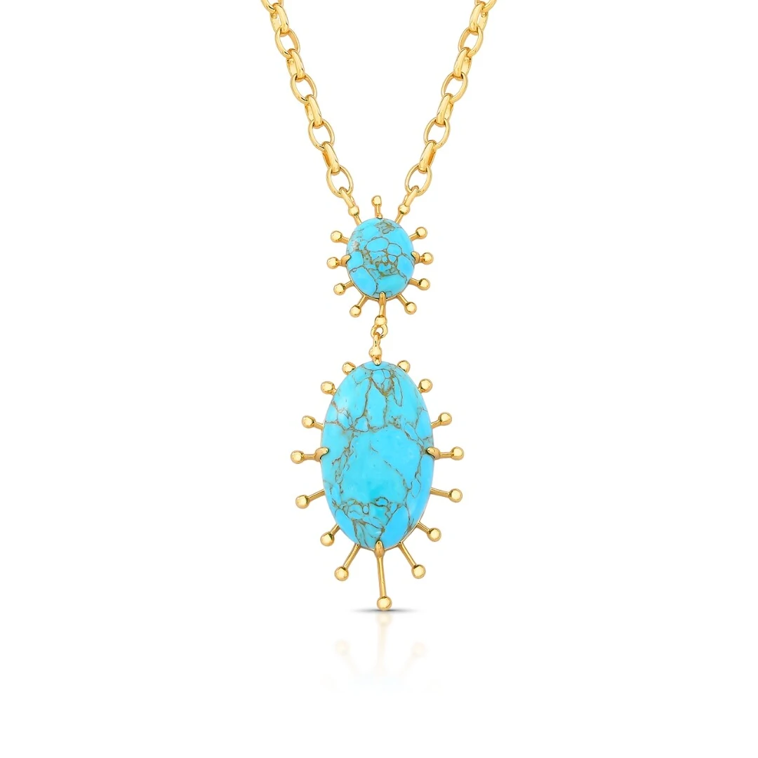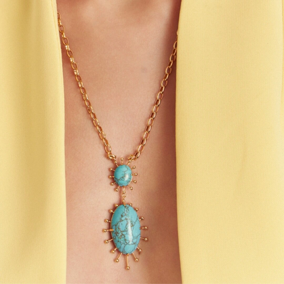 O Colar Pêndulo Oval Turquesa Banho de Ouro 18K é uma peça marcante, sofisticada e cheia de personalidade.