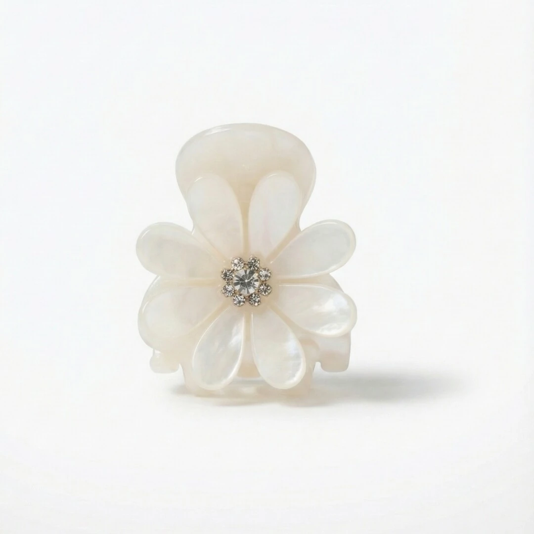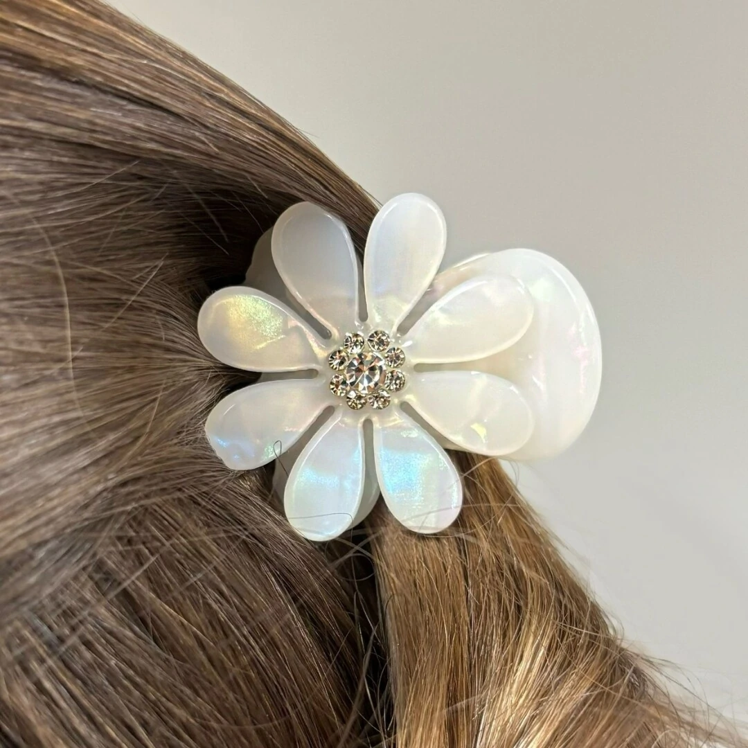 Seu acabamento em madrepérola traz um brilho suave e atemporal, enquanto o miolo com cristais adiciona um ponto de luz refinado, elevando o visual do penteado com sutileza.