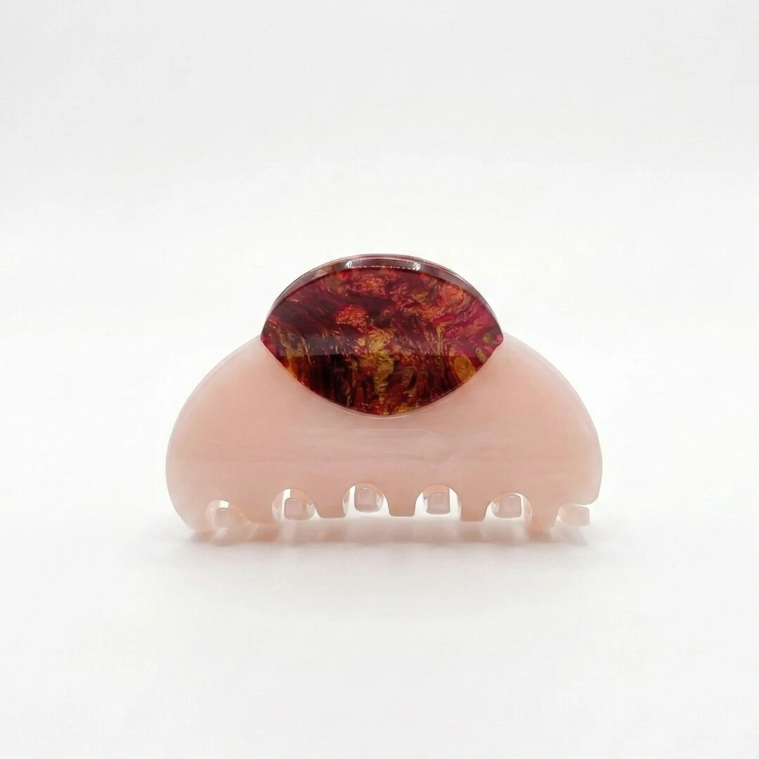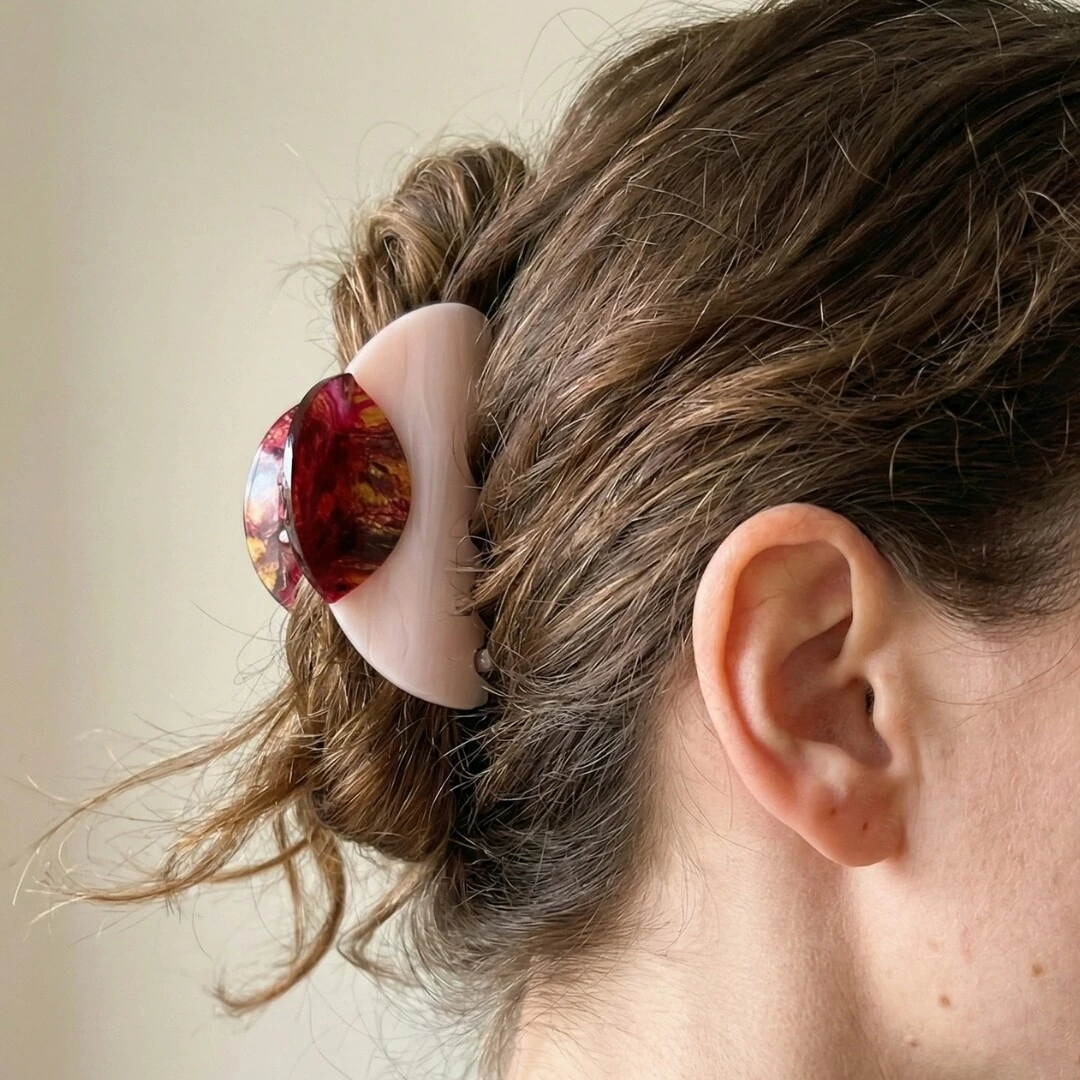 Seu design bicolor combina o tom suave da madrepérola com detalhe superior em contraste, criando um visual sofisticado e delicado que valoriza qualquer penteado. Versátil, é ideal para prender cabelos médios a longos com segurança, seja em coques elegantes, semi-presos ou penteados práticos do dia a dia.
