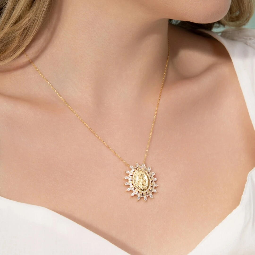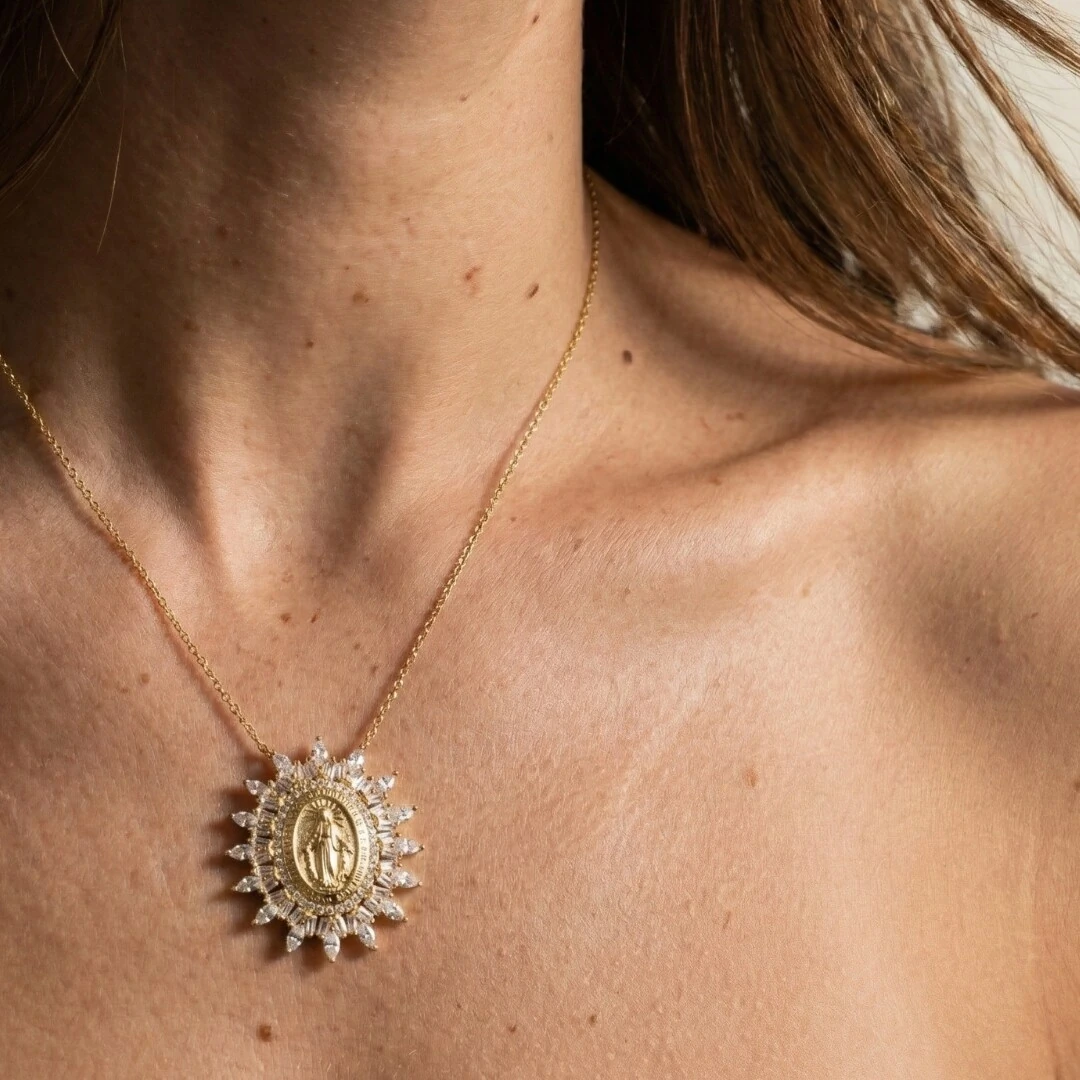 O pingente apresenta a imagem de Nossa Senhora das Graças em relevo, envolvida por uma moldura elegante cravejada com zircônias lapidadas em formato navete, que criam um efeito de luz intenso e delicado ao redor da medalha. O contraste entre o dourado do metal e o brilho das zircônias confere presença e sofisticação à peça, sem perder a leveza visual.