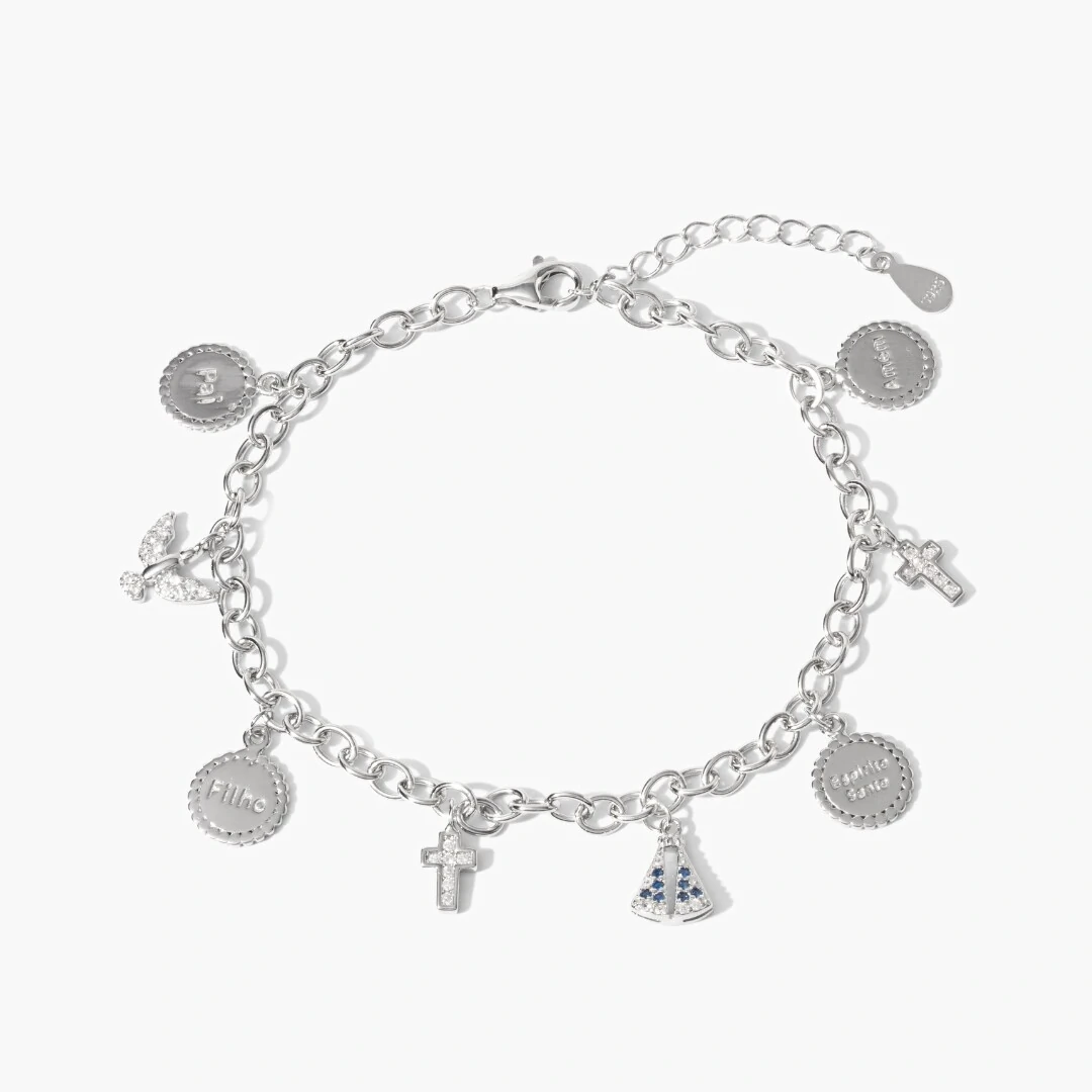 O design em elos robustos recebe medalhas gravadas com as palavras “Pai”, “Filho”, “Espírito Santo” e “Amém”, criando uma composição simbólica e especial. A pulseira é complementada por pingentes religiosos delicados, incluindo Espírito Santo, cruz e Nossa Senhora Aparecida, que adicionam ainda mais significado e beleza à peça.