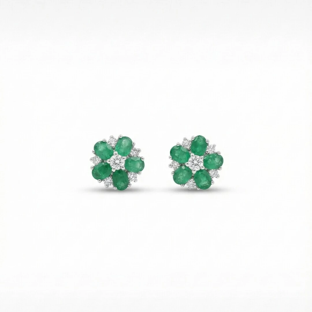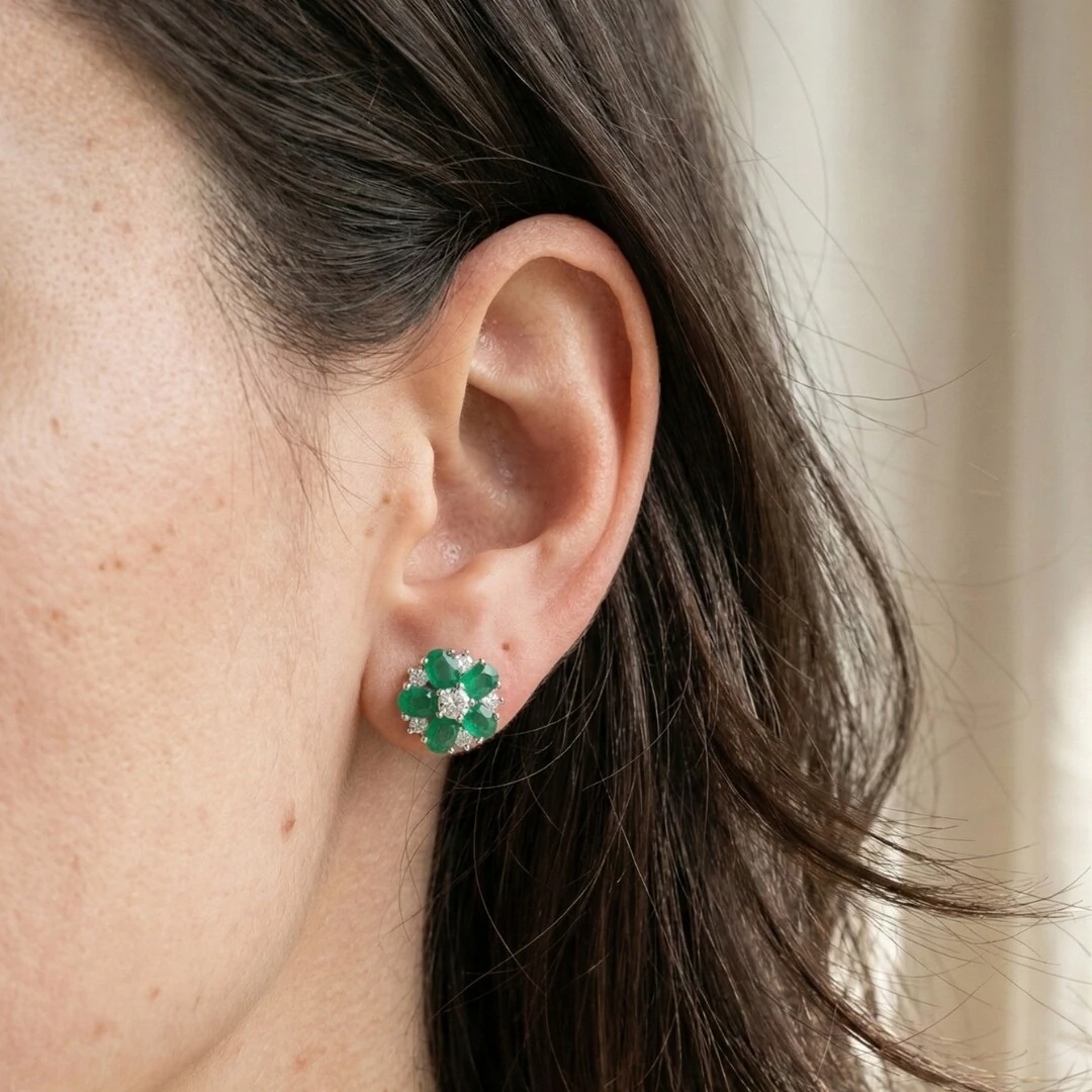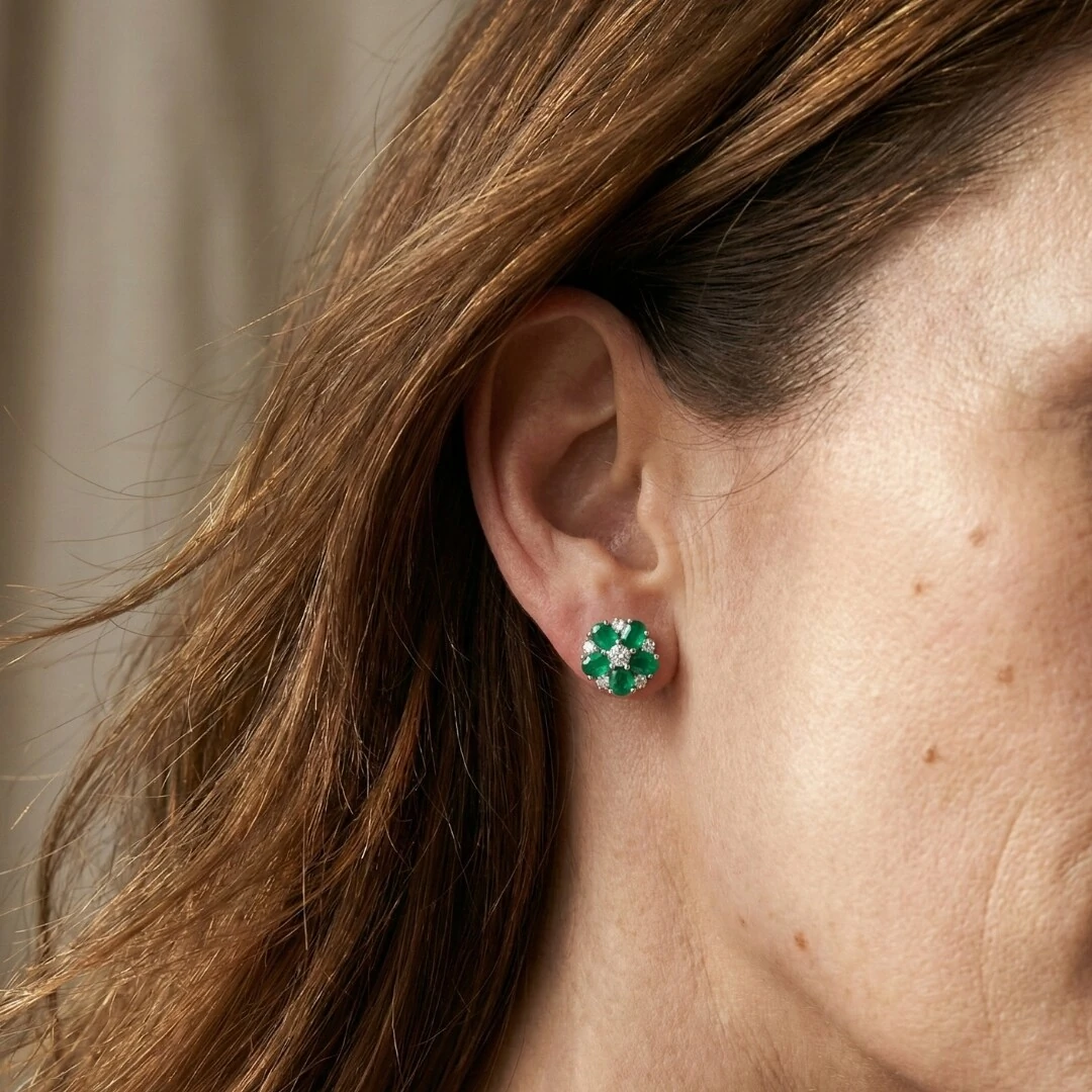 O formato de flor é composto por pedras em esmeralda fusion, cuidadosamente lapidadas, que criam um visual intenso e sofisticado. No centro e entre as pétalas, zircônias cristal acrescentam luminosidade e equilíbrio à composição, realçando ainda mais o desenho da peça.