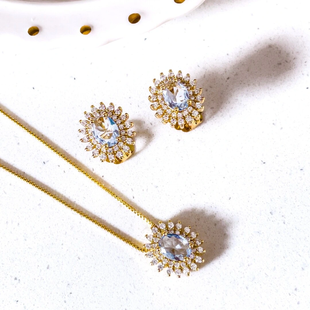 O Conjunto Oval Brisa Azul Claro com Banho de Ouro 18K tem aquele brilho suave que acalma e ilumina ao mesmo tempo. Elegante, delicado e nada óbvio.