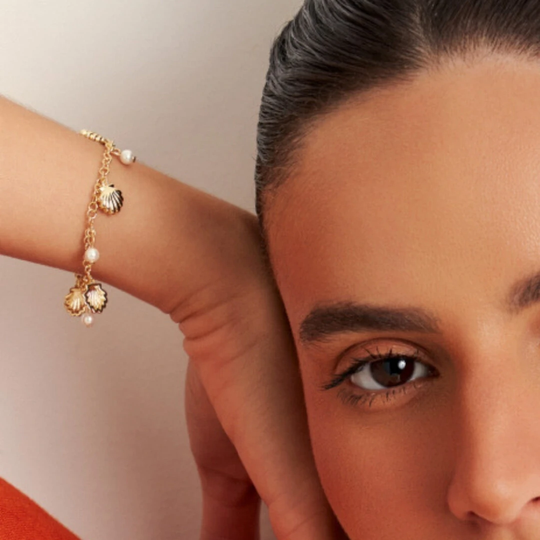 A Pulseira Conchas e Pérolas Shell com Banho de Ouro 18K é daquelas peças que trazem charme instantâneo ao look. Leve, delicada e com uma pegada fresh que combina com tudo.