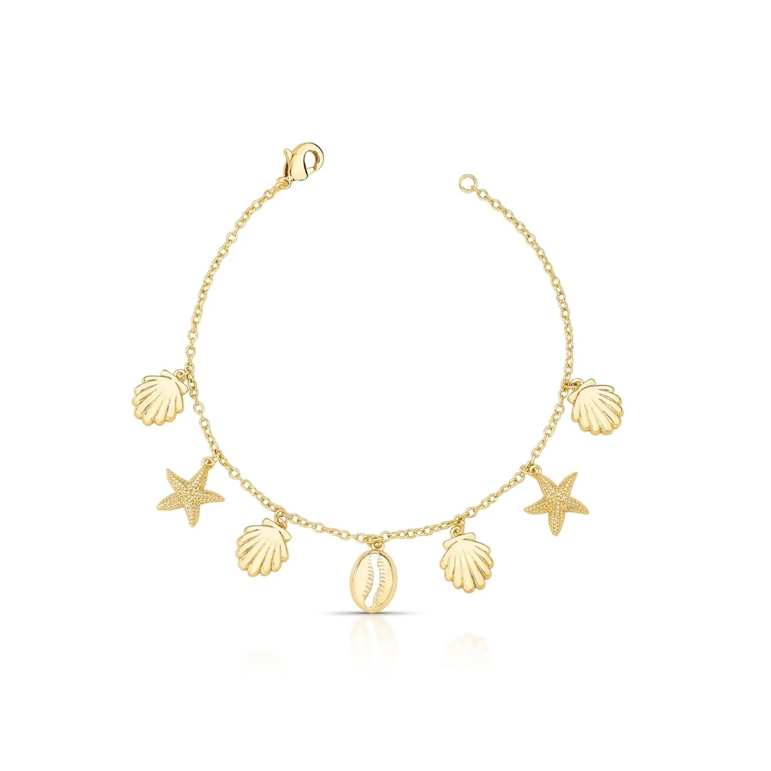 Os pingentes lisos de concha, búzios e estrela do mar aparecem intercalados na malha de elos ovais, criando movimento e um visual super agradável no pulso. É confortável, fácil de usar e combina tanto com produções básicas quanto com looks mais arrumadinhos.