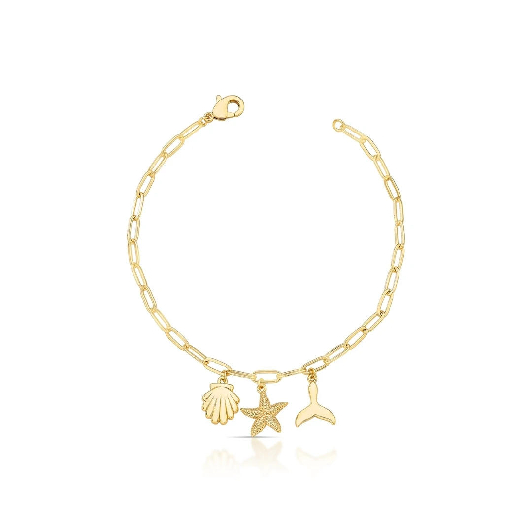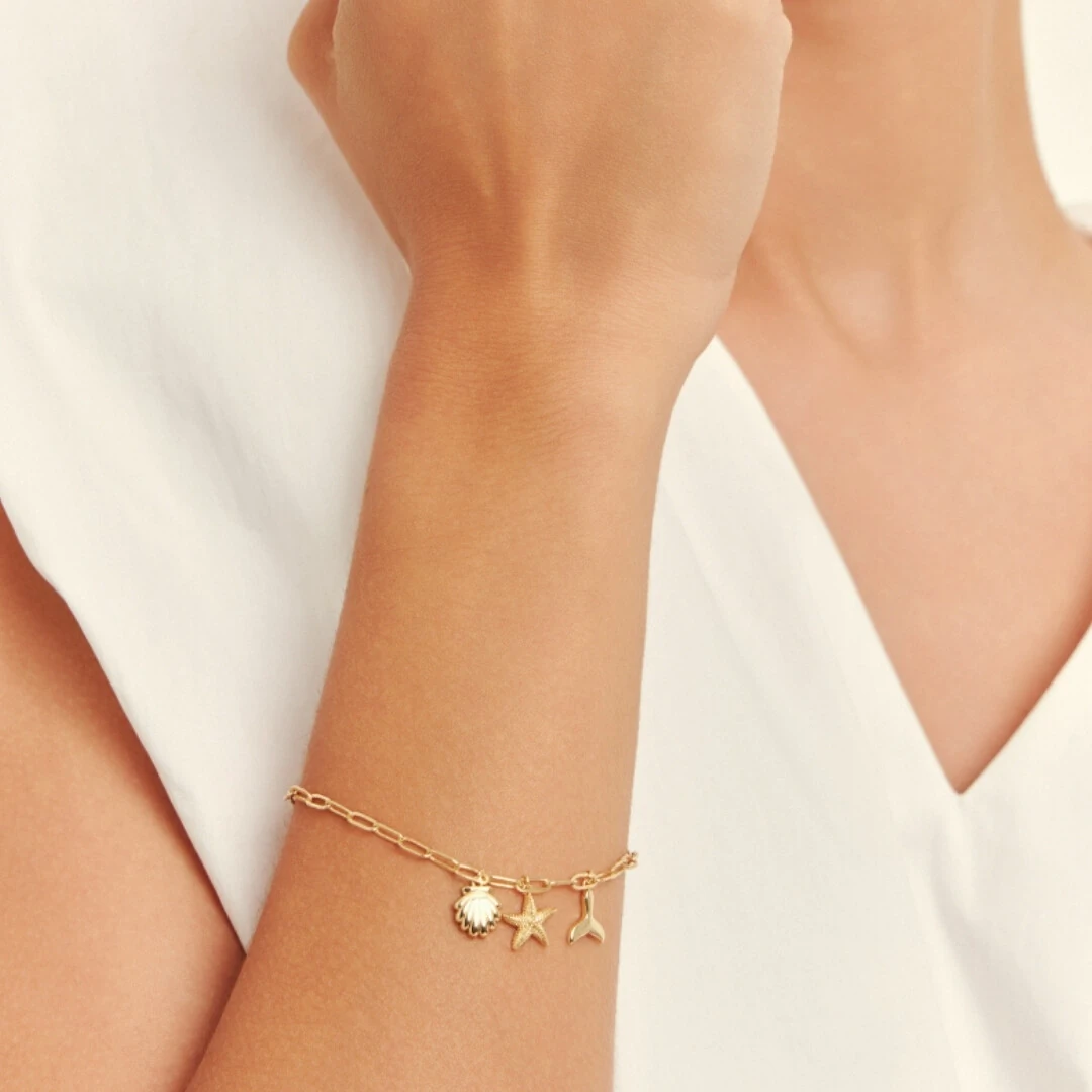 Confeccionada em malha de elos ovais, ela traz pingentes lisos de concha, estrela do mar e cauda de sereia, criando um visual charmoso e cheio de personalidade. É confortável no pulso e perfeita para usar sozinha ou em mix com outras pulseiras.