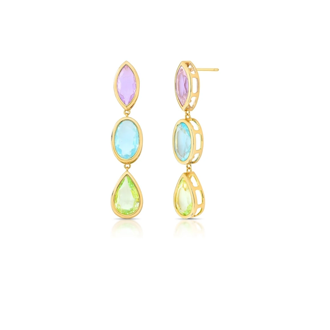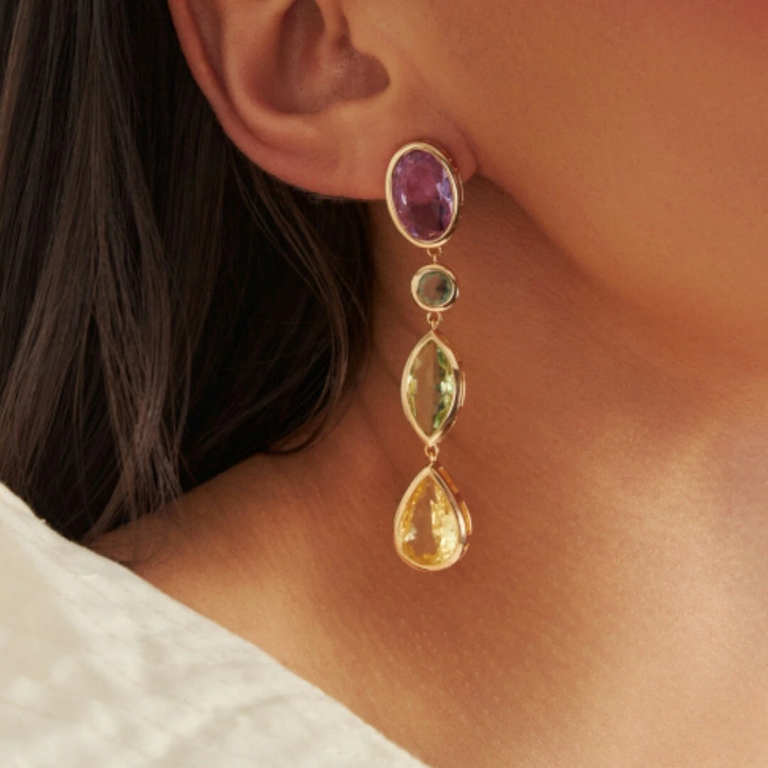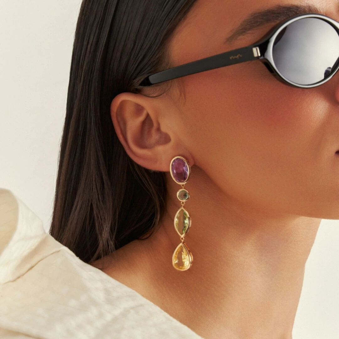 Os cristais coloridos aparecem em um design sofisticado nos formatos navete, oval e gota, com lateral vazada, criando movimento e um brilho lindo ao longo do rosto. É um brinco pêndulo que alonga, valoriza e transforma o look sem exagero.