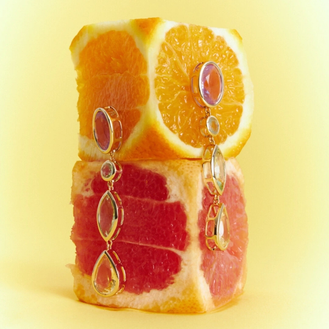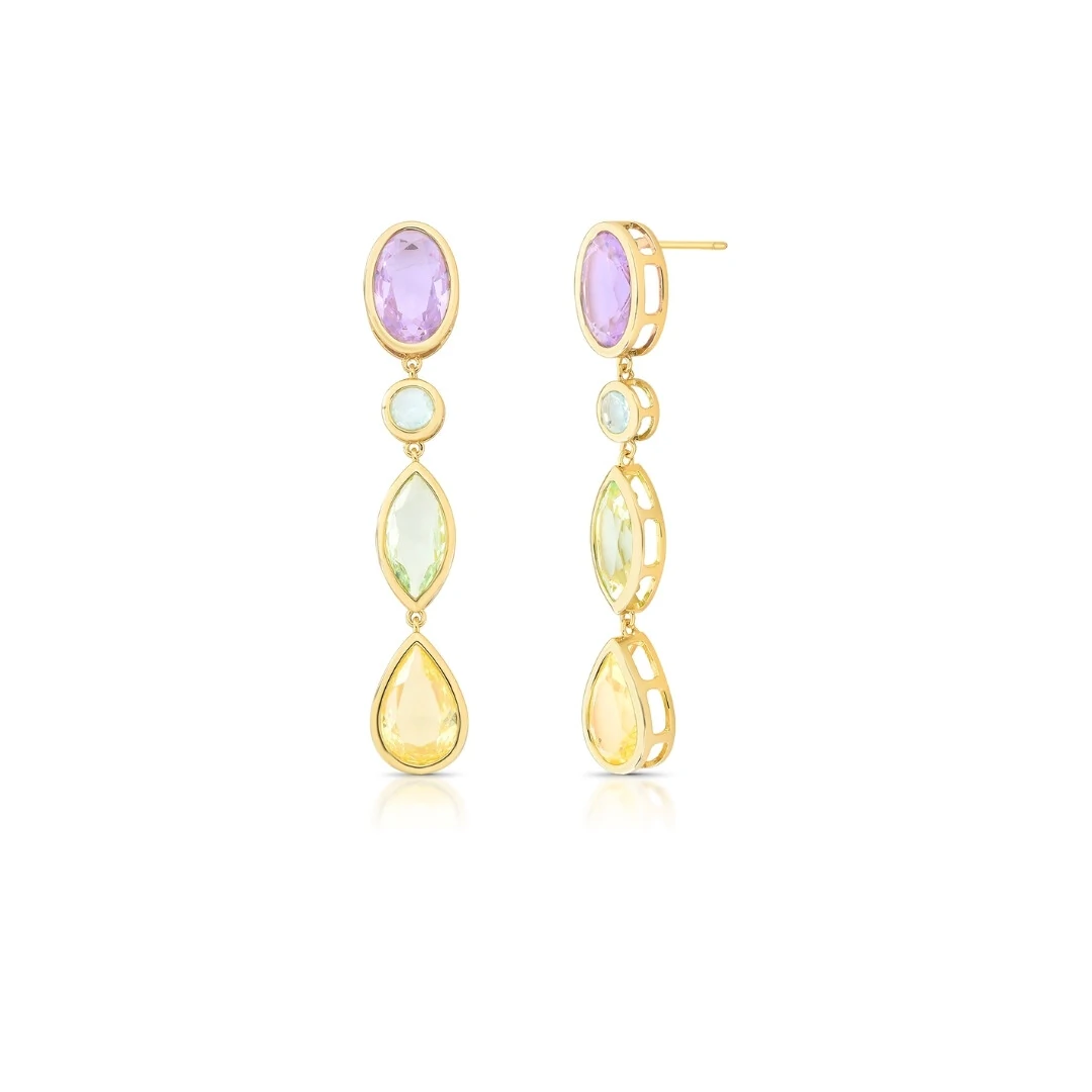 Os cristais coloridos aparecem em uma sequência harmoniosa nos formatos oval, navete e gota, com laterais vazadas que deixam a peça ainda mais sofisticada e com um brilho lindo em movimento. Ele alonga o visual, ilumina o rosto e transforma até o look mais simples.
