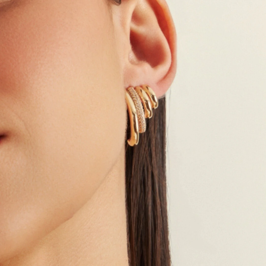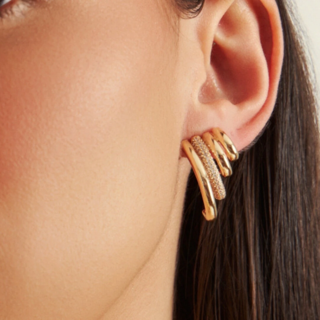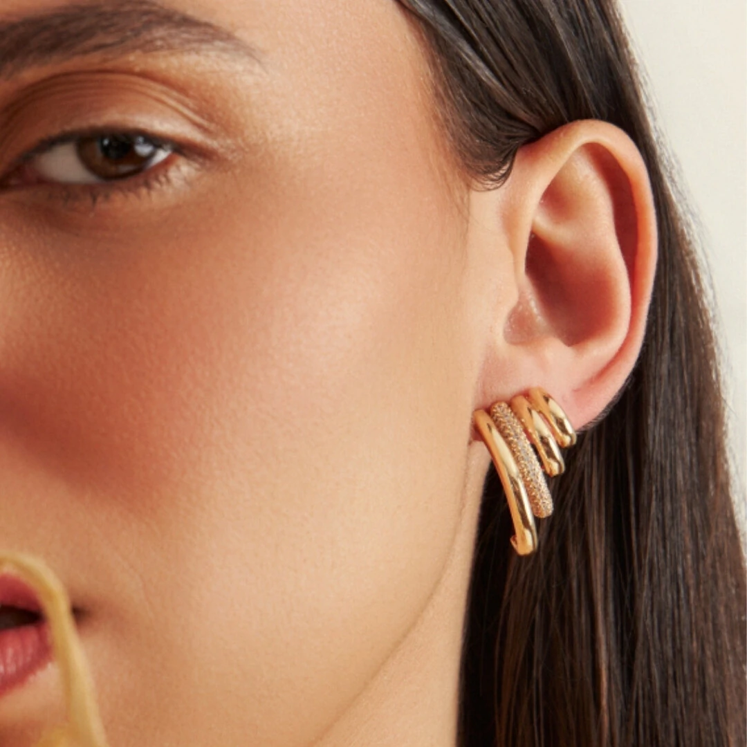 O Brinco Quatro Voltas Brisa com Banho de Ouro 18K é aquele modelo que chama atenção sem esforço. O design em quatro curvas traz movimento, estilo e um visual super atual, enquanto a fileira de zircônias adiciona brilho na medida certa.