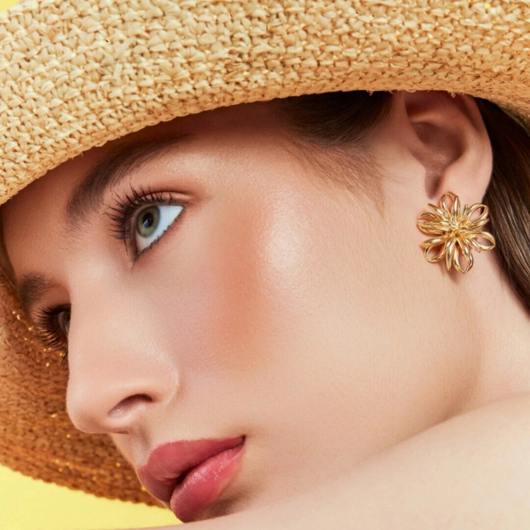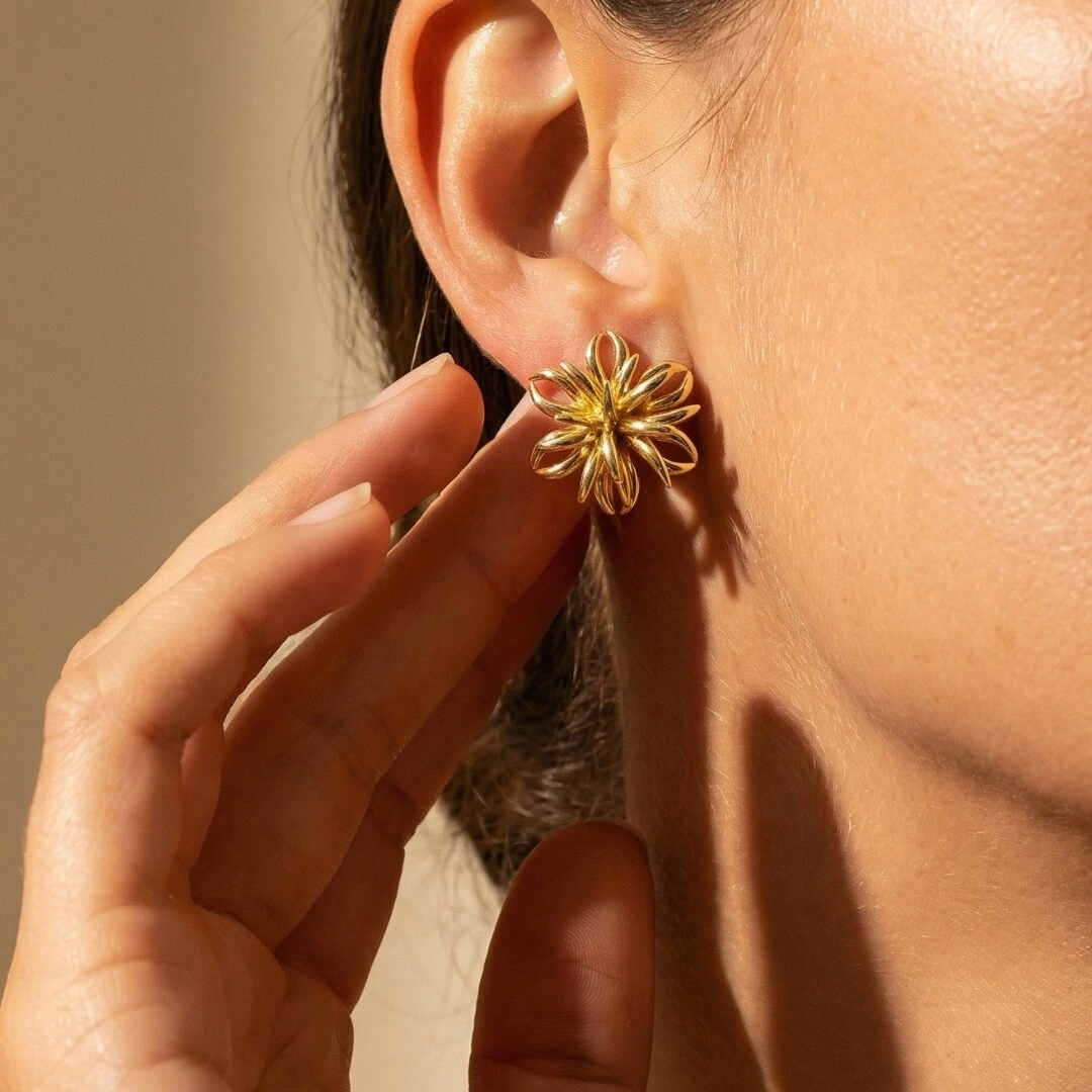 O Brinco Flor Navete Brisa com Banho de Ouro 18K é daquelas peças que não passam despercebidas. O desenho em formato de flor, criado a partir de navetes vazadas, traz volume, movimento e um visual super atual.