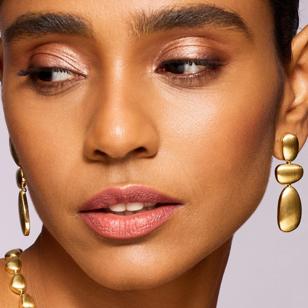 O acabamento fosco acetinado é a assinatura da coleção Duna, um dourado macio, elegante, nada óbvio. Ele ilumina o rosto sem exagero, deixando o visual moderno e extremamente feminino.