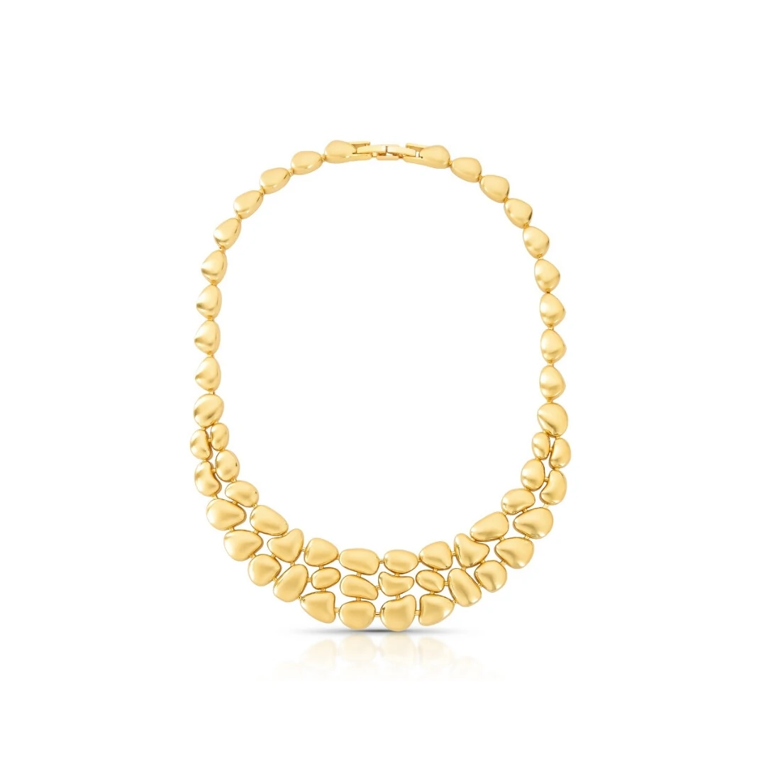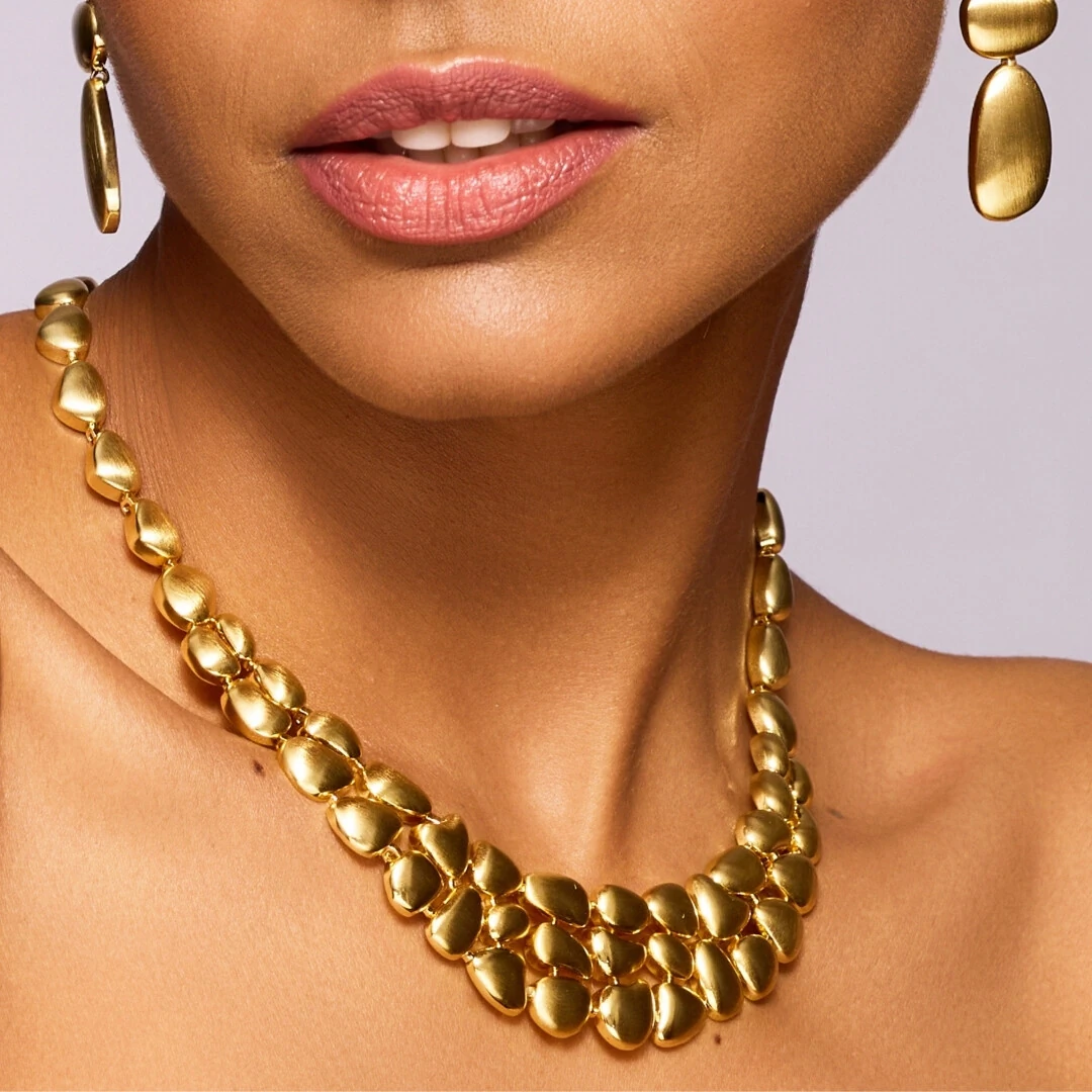 O Colar Brisa Orgânico é pura presença. Com formas suaves e volumes que se encaixam como se fossem esculpidos pelo vento, ele cria aquele efeito poderoso que faz toda produção parecer pensada.