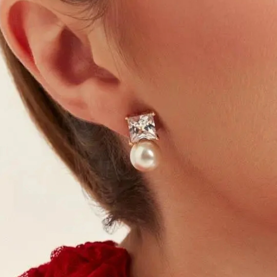 O Brinco Zircônia Quadrada com Pérola Shell Banho de Ouro 18K é aquele clássico moderno que nunca sai de moda.