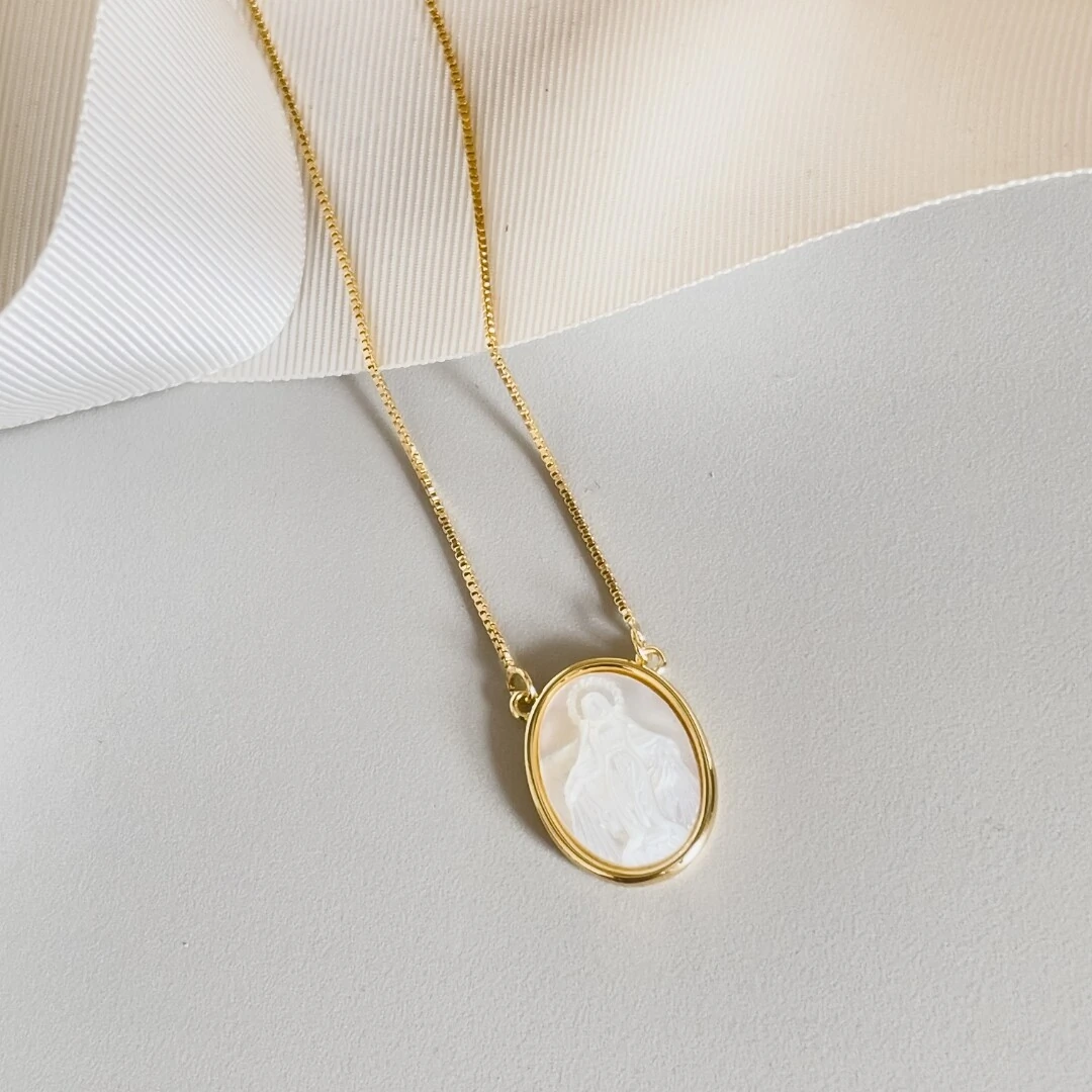 Delicado, atemporal e cheio de significado. O Colar Minimalista Nossa Senhora das Graças P é confeccionado com pingente oval em madrepérola, que traz suavidade e um brilho natural elegante, perfeito para quem ama joias discretas e simbólicas.