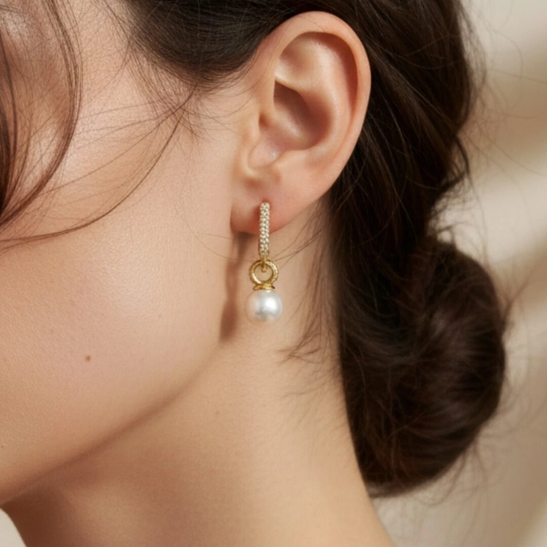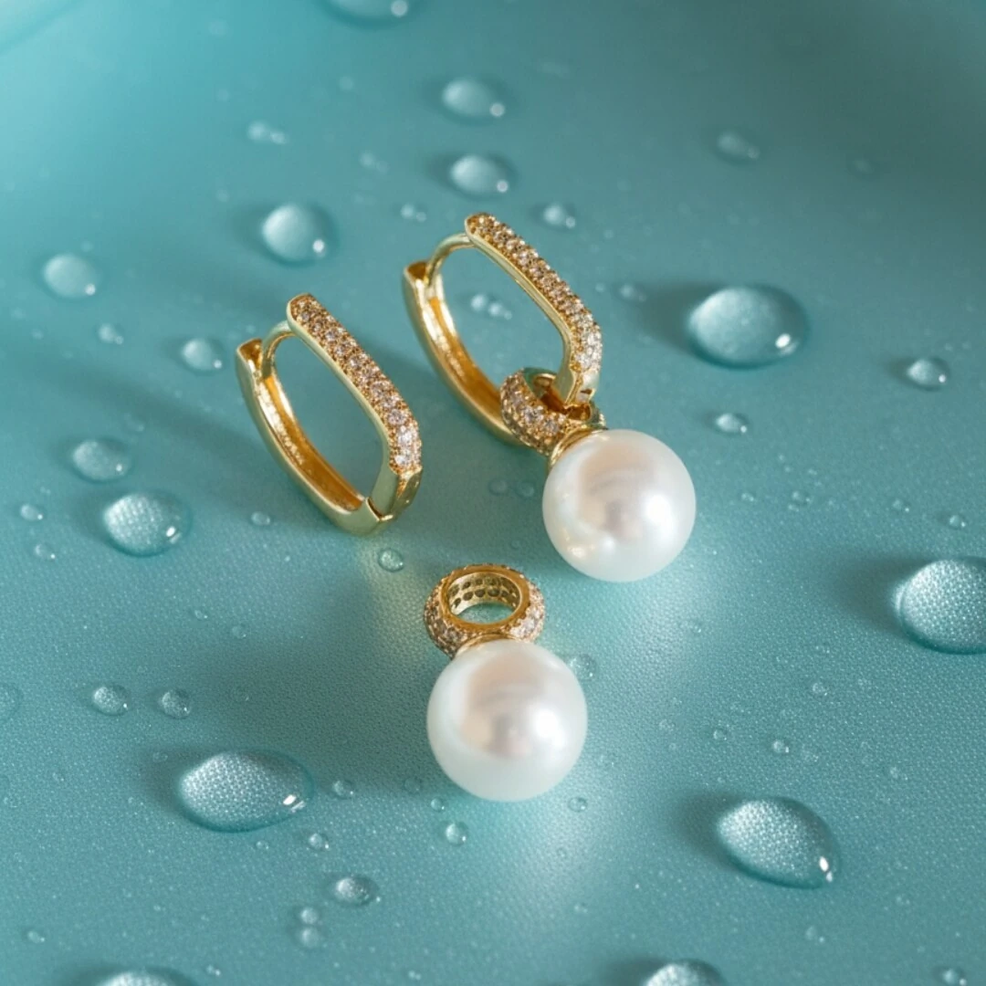 A combinação das zircônias com o brilho delicado da pérola cria um contraste clássico que nunca sai de moda.