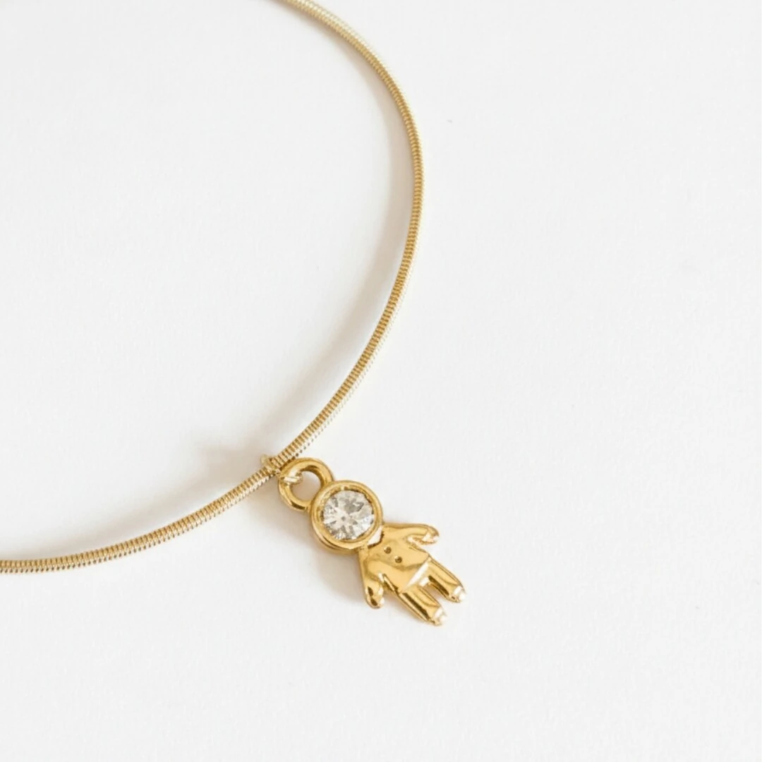 A Pulseira Corda de Violão Menino Banho de Ouro 18K é uma peça delicada, moderna e cheia de significado. Com design minimalista, ela traz a clássica malha estilo corda de violão e um pingente de menino com detalhe em zircônia, que adiciona brilho na medida certa.