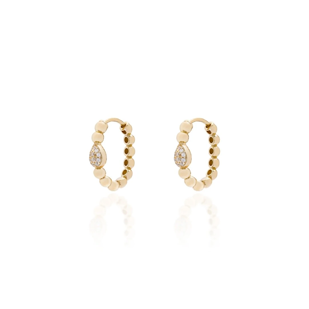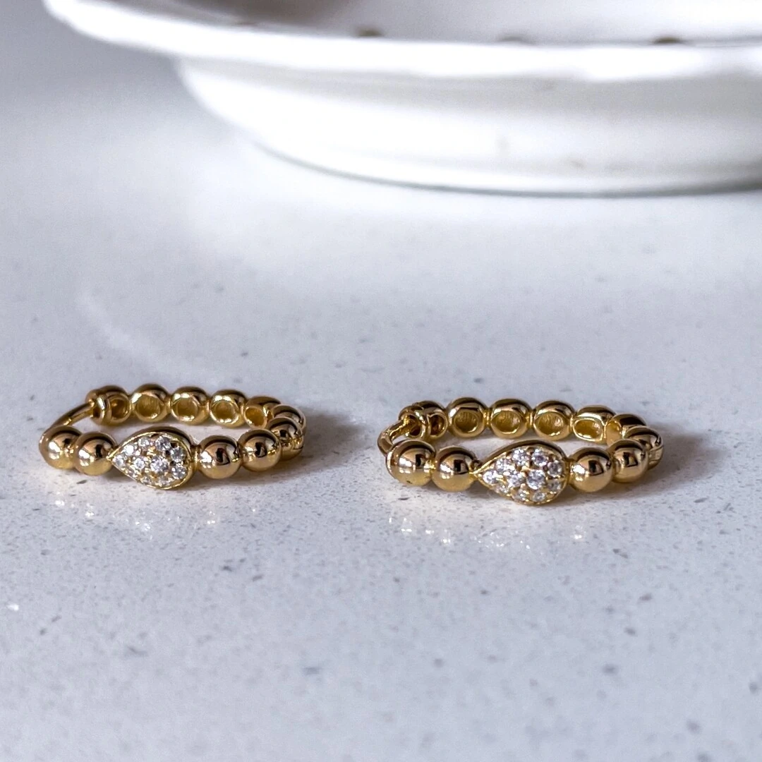 A estrutura da argola é formada por pequenas bolinhas douradas que criam textura e elegância. O destaque fica para o pingente em formato de gota cravejado com zircônias, trazendo brilho sutil e um toque refinado ao visual.