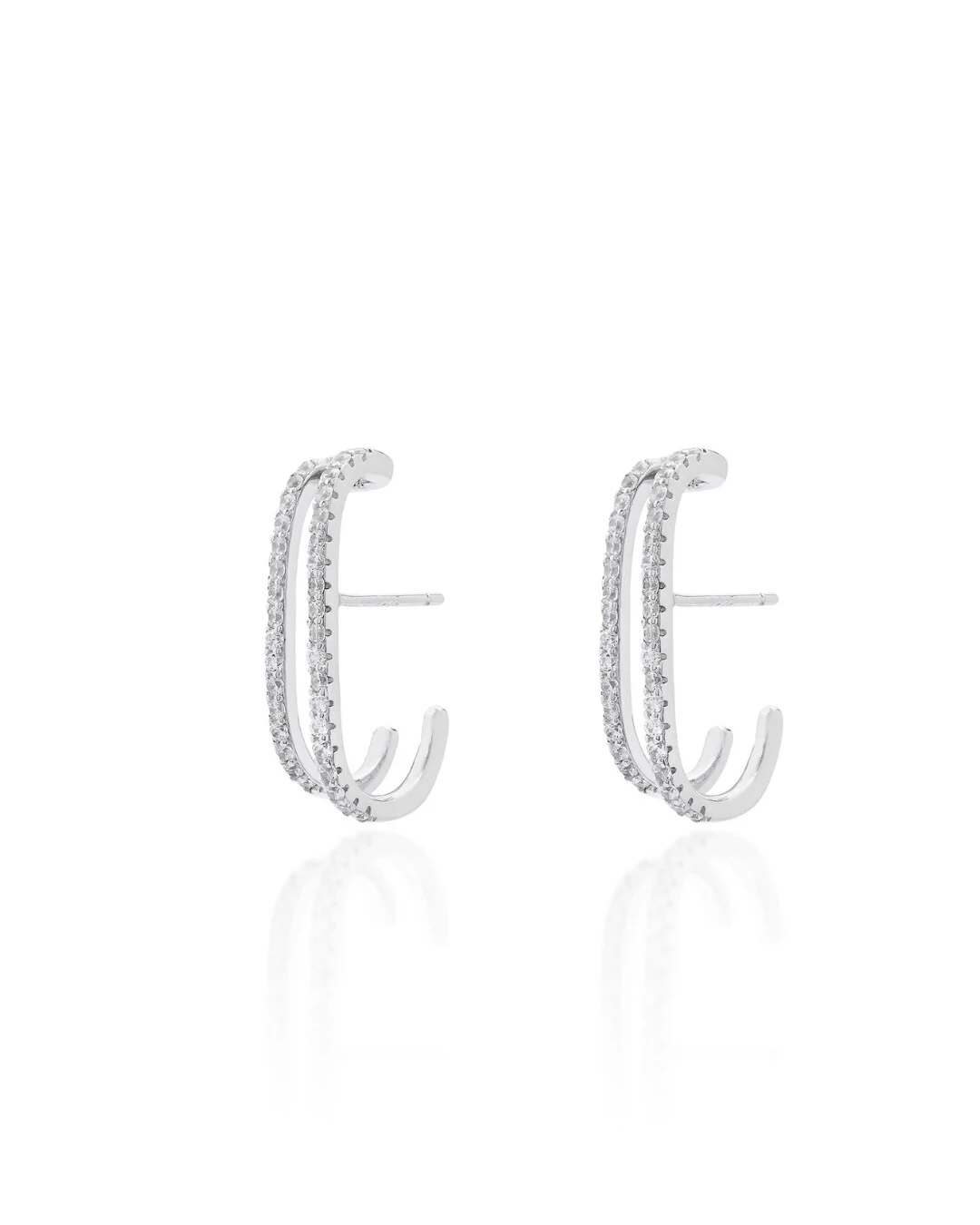 Seu design acompanha o formato da orelha em estilo ear hook, criando um efeito sofisticado e contemporâneo. As duas fileiras de zircônias trazem brilho intenso e destacam o visual com elegância.