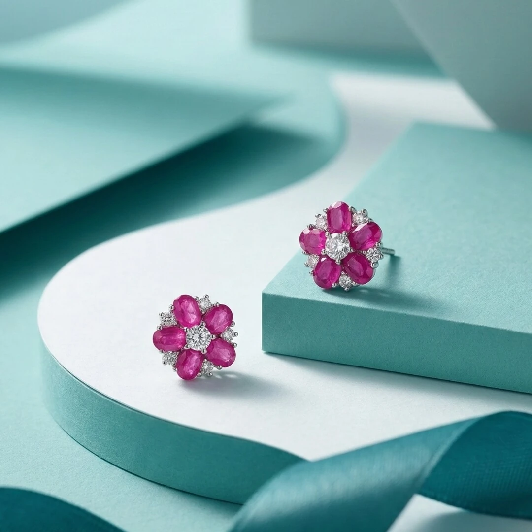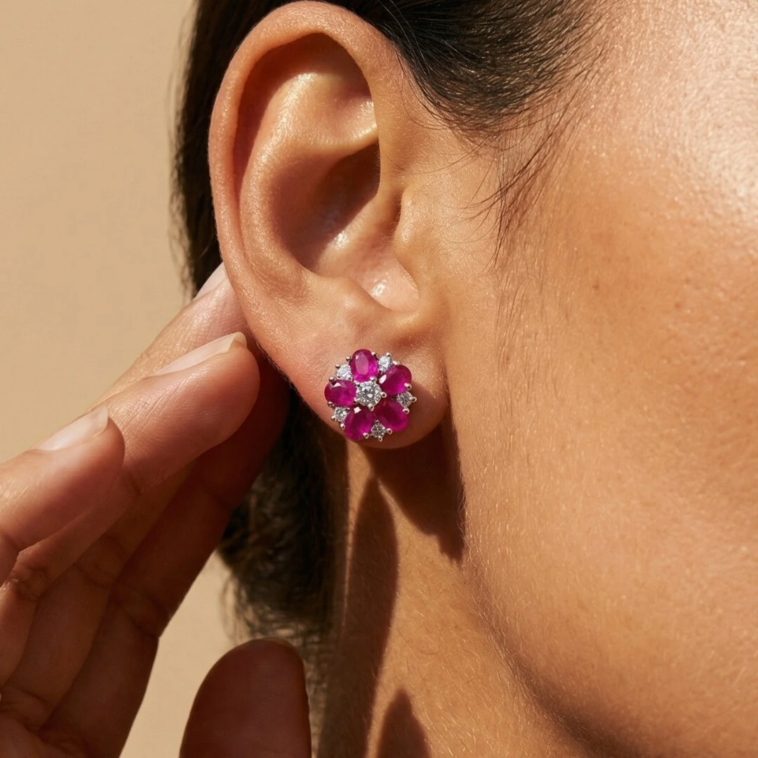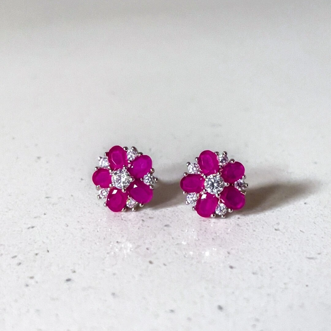 O Brinco Flor Rubi Colombiana Fusion em Prata 925 é uma peça delicada e sofisticada que combina brilho e cor em um design floral elegante.
