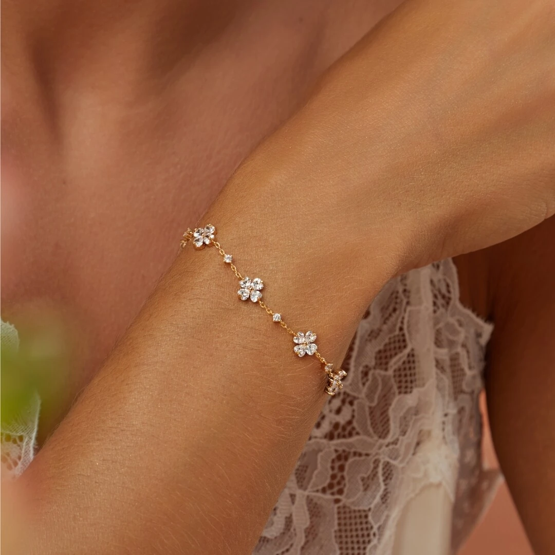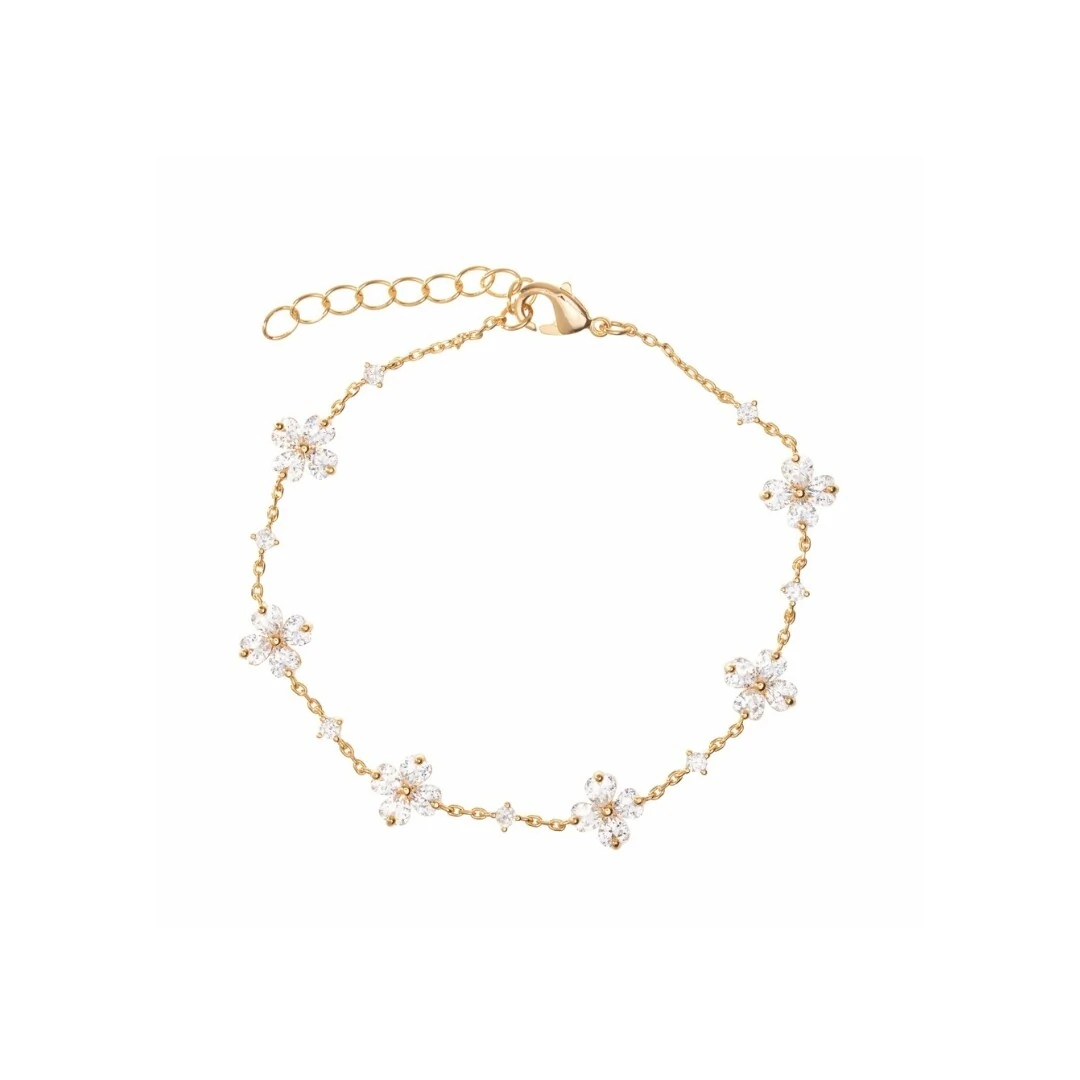 Delicadeza e sofisticação em uma pulseira! Design formado por pequenas flores cravejadas em zircônia branca, interligadas por corrente delicada em ouro. O banho de ouro 18k cria um acabamento luminoso e elegante.
