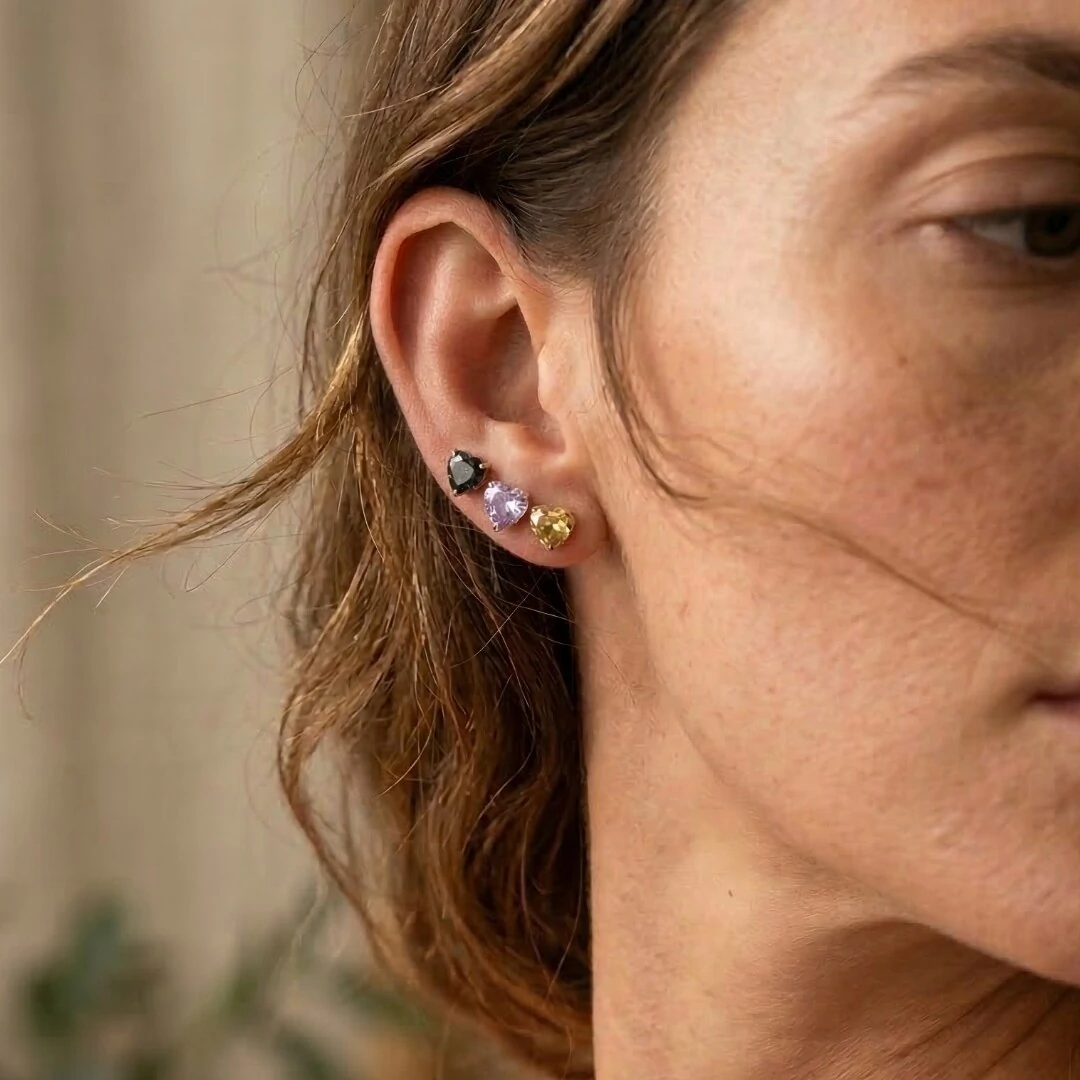 Versatilidade e charme! Conjunto com 3 brincos em formato coração com lapidação brilhante, medindo 9mm. As cores variadas (dourado, rosa e roxo) oferecem opções para diferentes looks. O banho de ródio branco garante durabilidade e brilho duradouro.