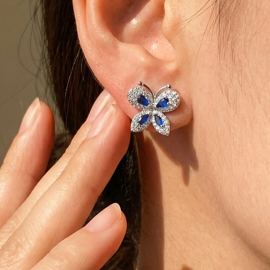 Elegância em azul! Brinco em formato de borboleta, cravejado de zircônia safira azul nas asas e corpo cravejado em zircônia branca. Feito em prata 925 com banho de ródio branco. O design sofisticado combina delicadeza com brilho vibrante.