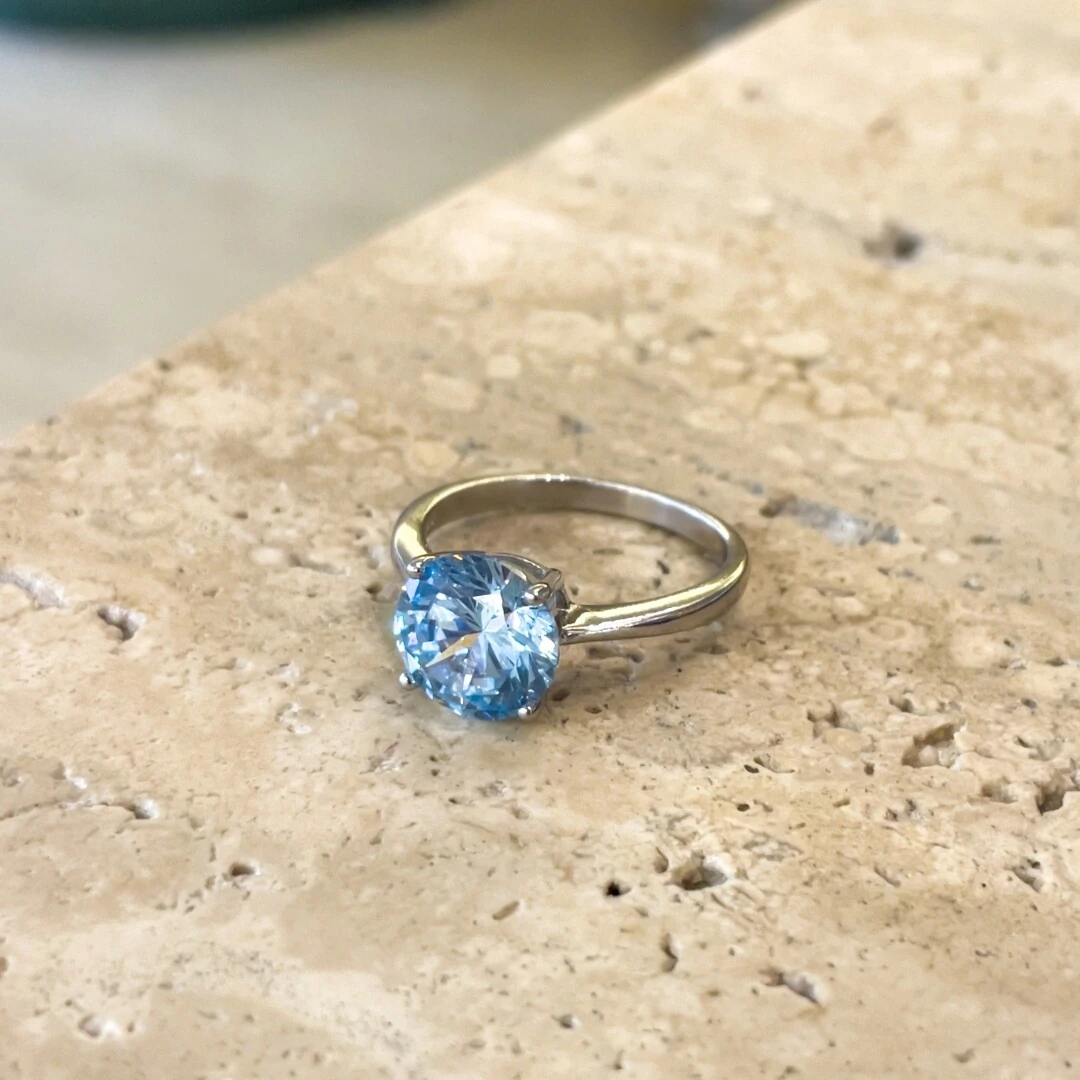 Elegância azul! Anel solitário em zircônia água marinha medindo 10mm, com brilho intenso e elegante. Feito em prata 925 com banho de ródio branco, oferece durabilidade e um acabamento sofisticado.