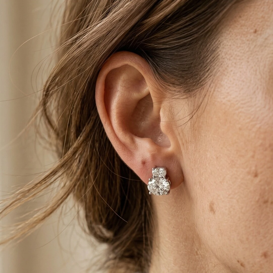 O Brinco Dois Ovais Moissanite em Prata 925 apresenta duas Moissanites ovais em tamanhos distintos — 8mm e 6mm — sobrepostas em um design que cria movimento, profundidade e um brilho que se multiplica a cada ângulo.