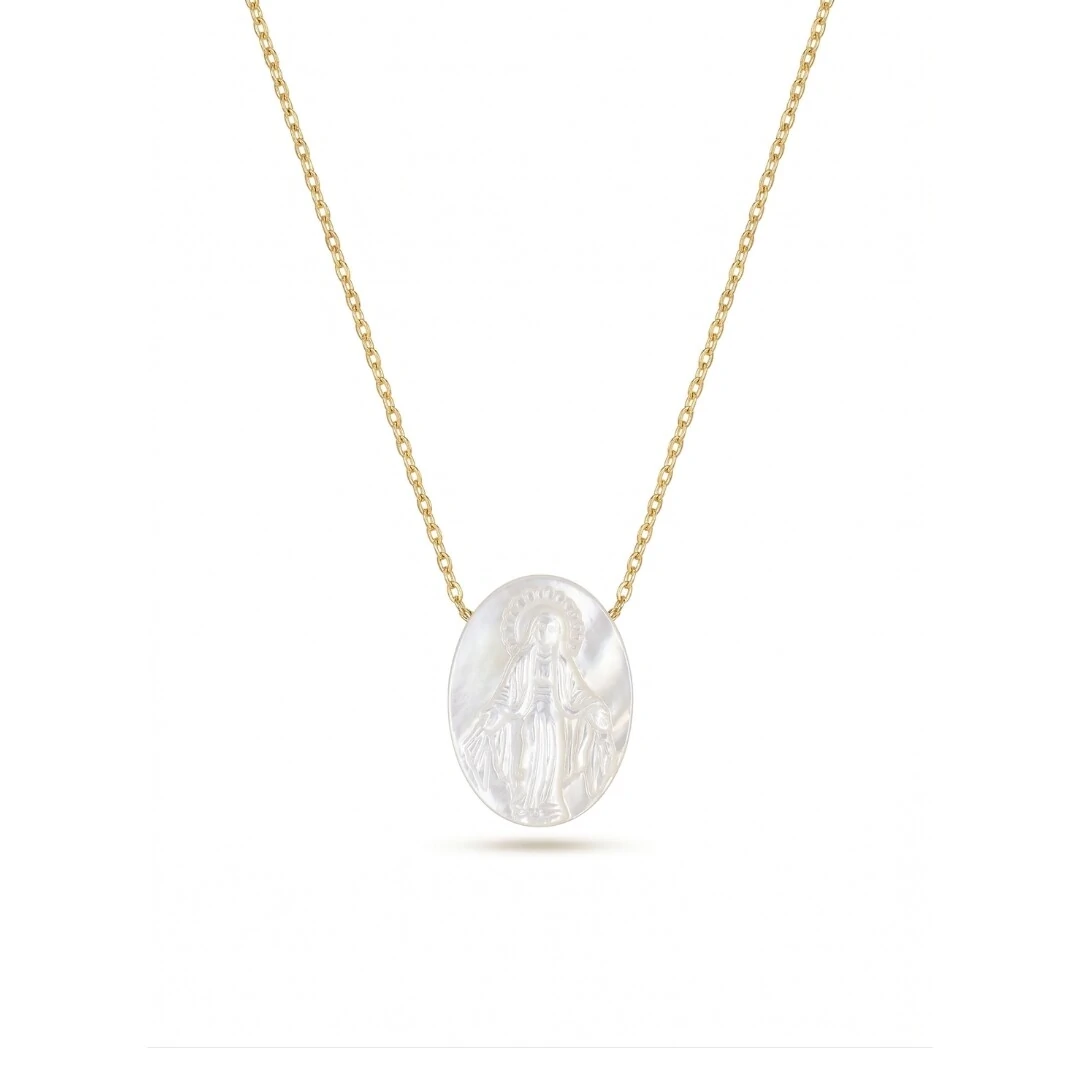 O Colar Oval Madrepérola Nossa Senhora das Graças em Prata com Banho de Ouro 18k une dois dos materiais mais preciosos da natureza — a madrepérola, com seu brilho nacarado único, e o ouro, com seu calor atemporal — em uma peça de devoção e sofisticação incomparáveis.